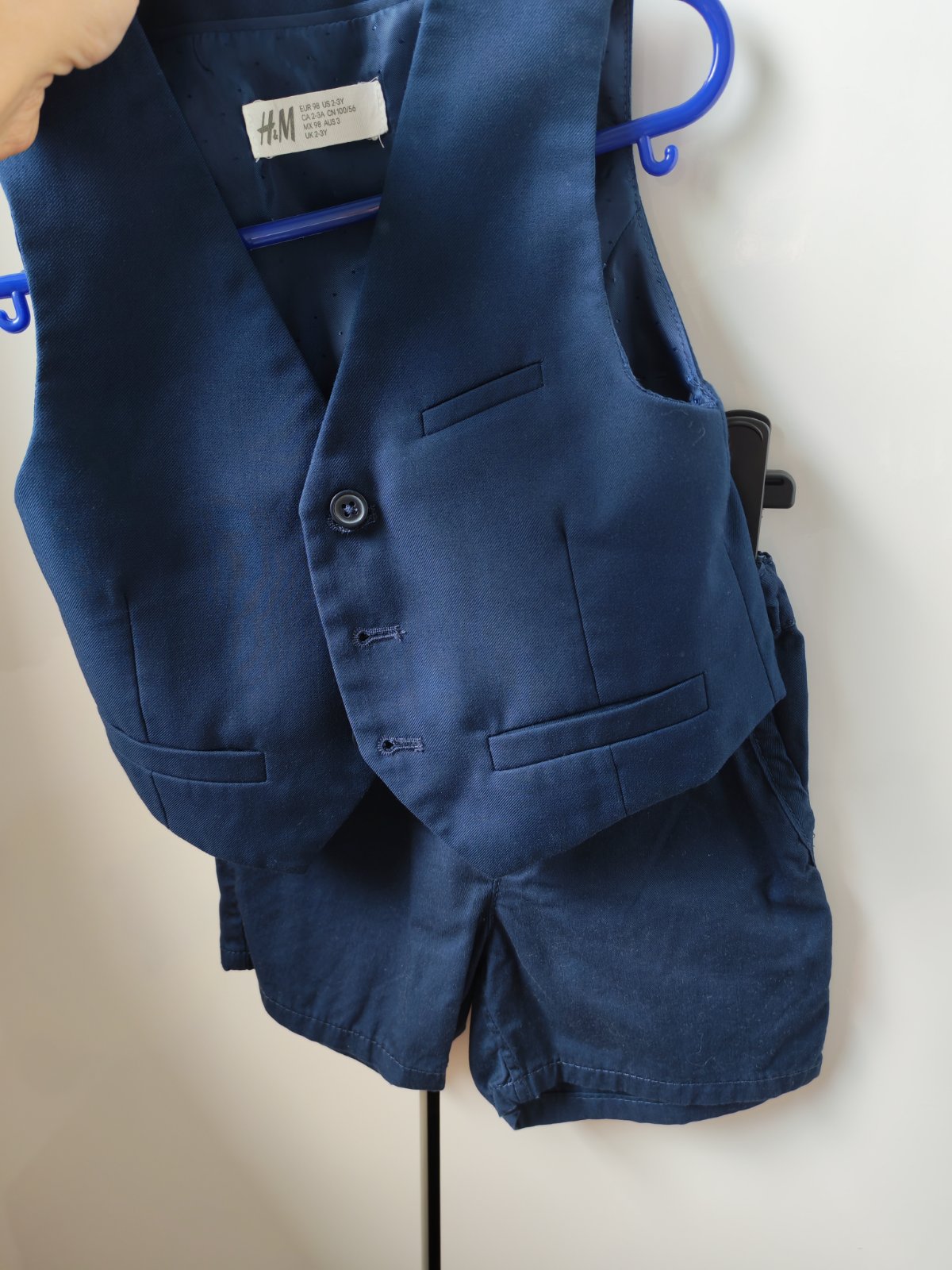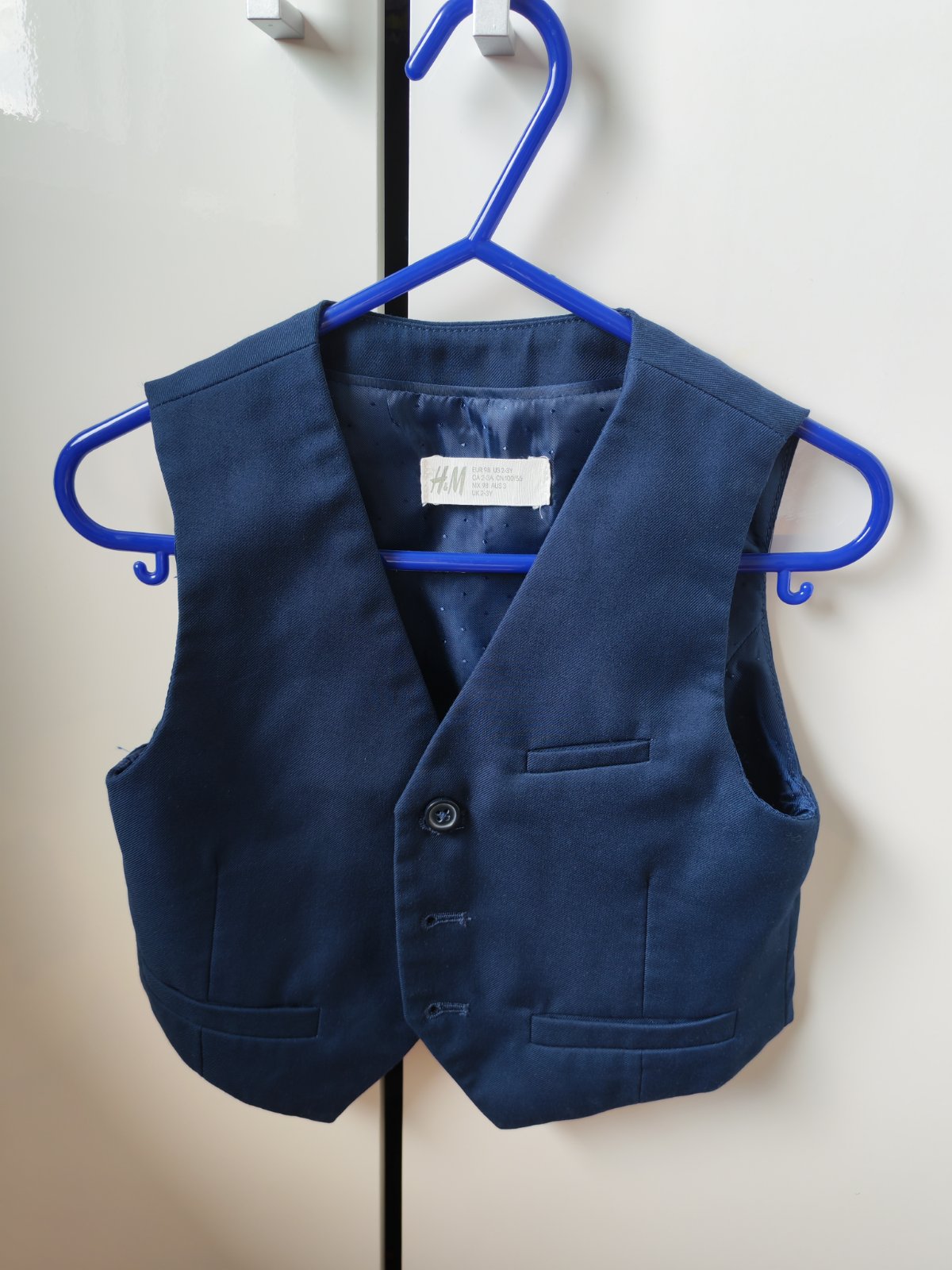 Tmavomodry elegantný svetrík skôr na veľkosť 80, písané je na 86 veľ - 18 mes. Naš ho mal obleceny len raz a to chvílu na svadbe a mal 14 mes, trochu mu bol veľký, ale to sa stratilo. Bez poškodenia.