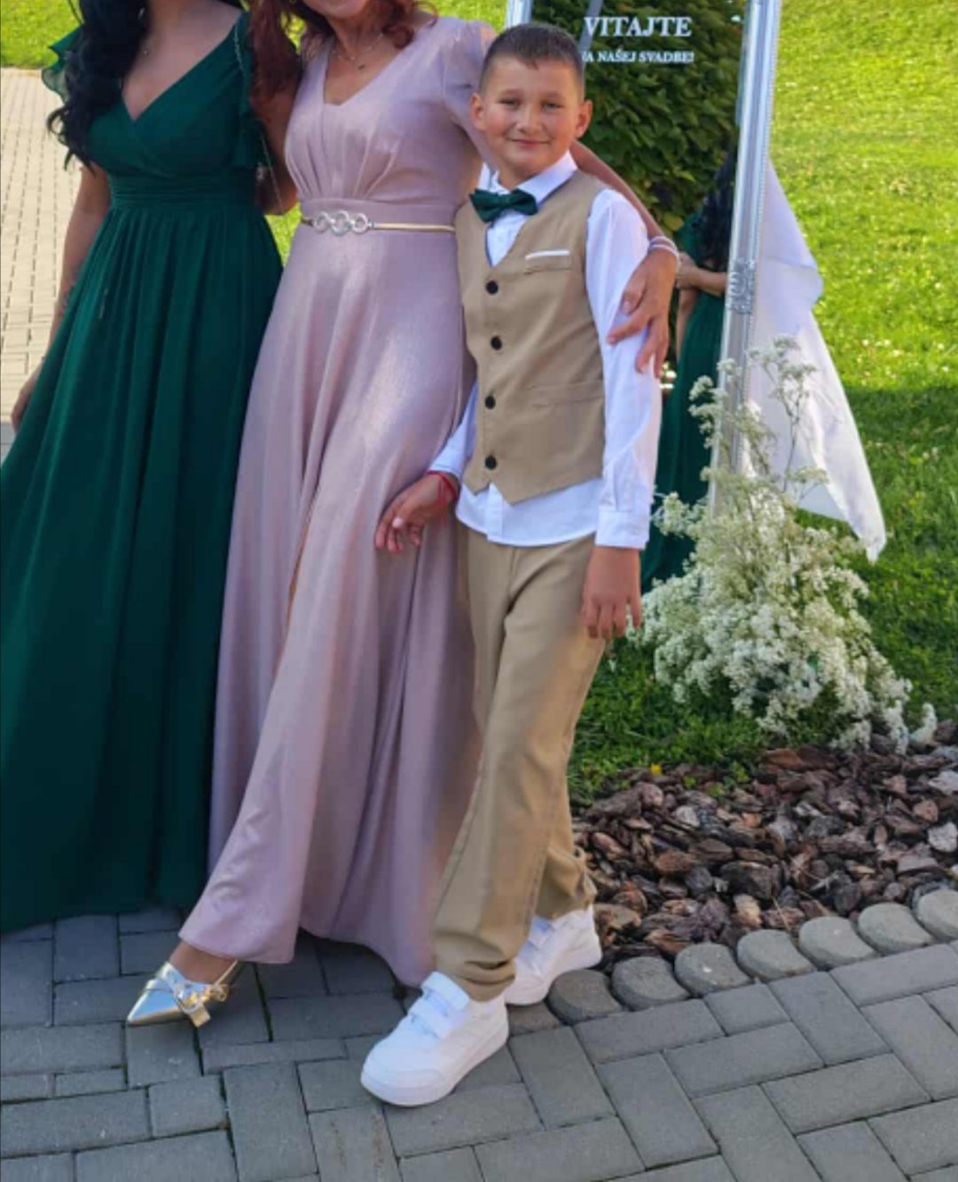 Oblek kúpený v Zara sedí aj na veľkosť 146 Raz oblečené na svadbe košeľa aj motýlik čierny iba oprata syn mal inú košeľu Topánky plus hnedý opasok Predám iba spolu Pôvodná cena bola 120 eur za v...