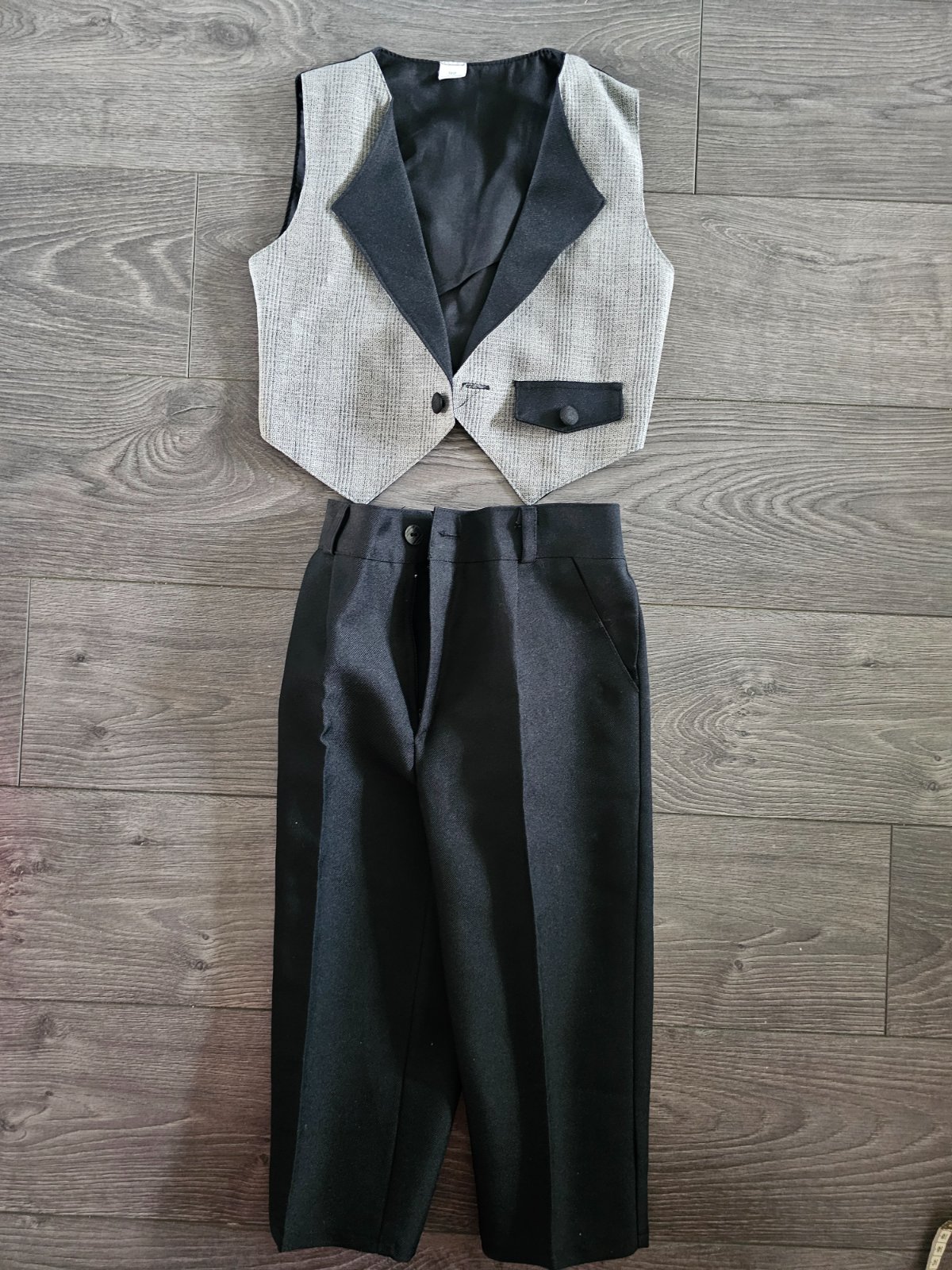 Detský oblek Žakár Elegantný chlapčenský oblek obsahuje: - čierne nohavice - biela košeľa - sivá žakárová vesta - francúzska kravata 100% PES Nohavice majú v páse gumičku v zadnej časti ...