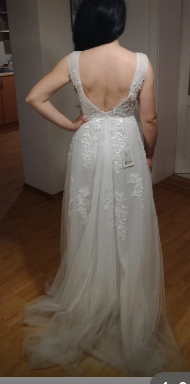 TOP STAV. Šaty kúpené v júli 2023 (ešte sú dva roky v záruke). 1x oblečené na 30 minút, nakoľko išlo o sobáš len za prítomnosti dvoch svedkov. Veľkosť je S/M, šaty sú elastické, veľmi príjemné na n...
