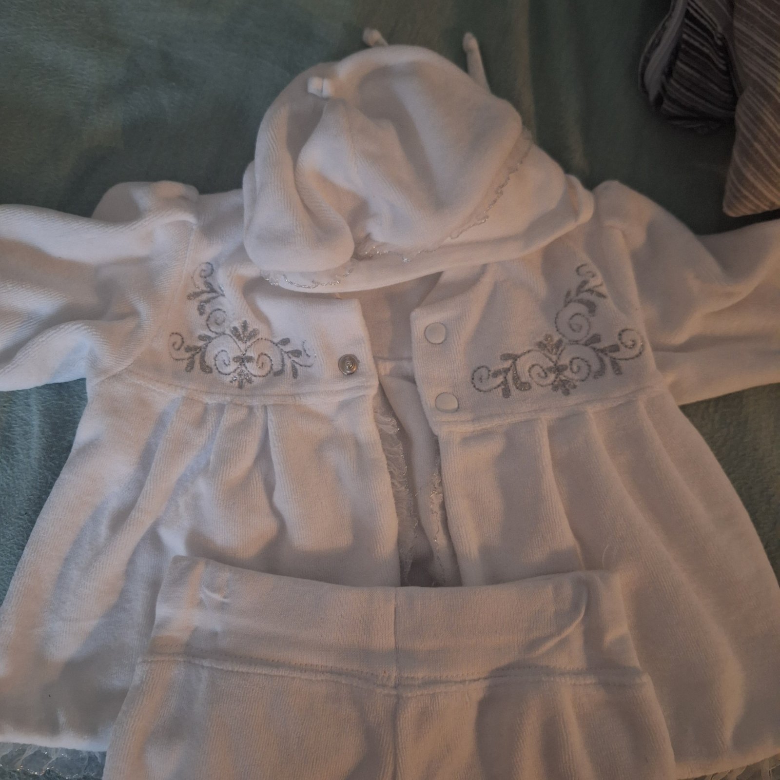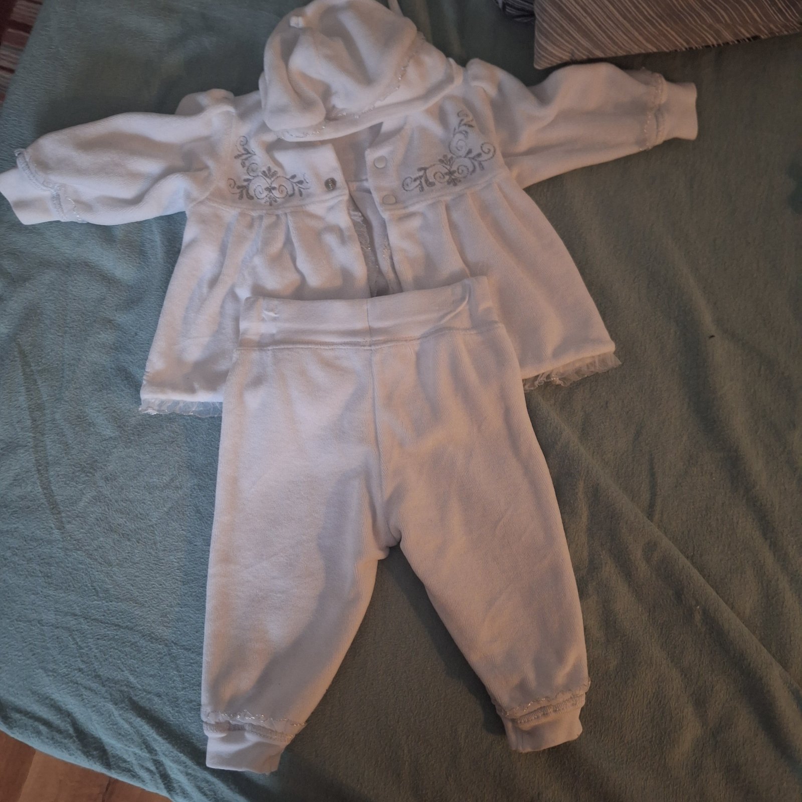 Predam po dcérke veci na krst kabatik nohavice a ciapku mala na krste v kostole len raz oblečené. Saty a leginy mala 3krat oblecene a tie mala na hostine. Saty a leginy 4€. Kabatik ciapka nohavice 8€