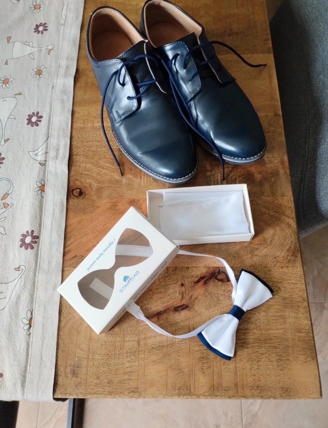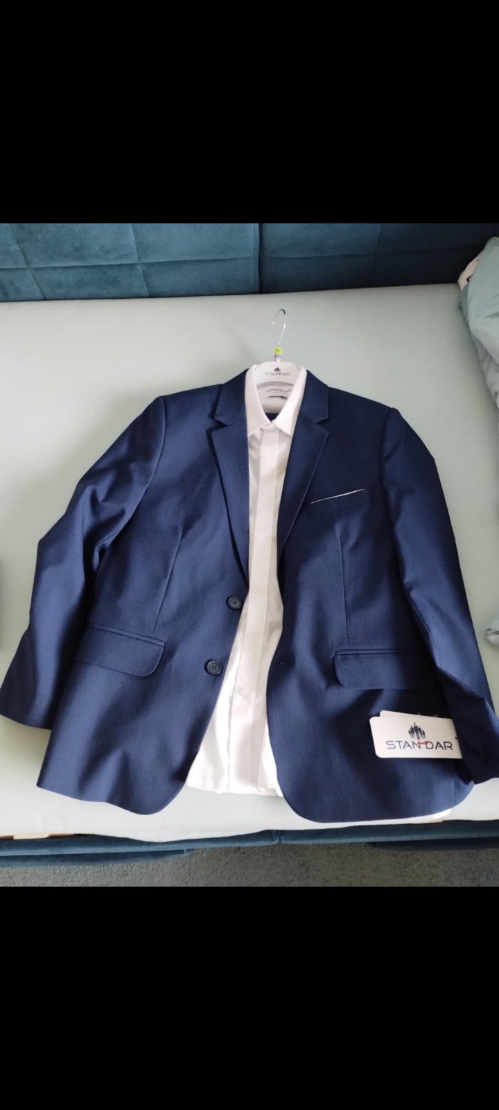 Ponúkam oblek pre chlapca č.152XL. Je pre pevnejšieho chlapca. K obleku je košeľa, topánky, opasok a motýlik. Kupované v obchode Ceremony shop. Všetko je značky Stan-dar. Pôvodná cena oveľa vyššia. Mali sme ho len raz oblečený, minulý rok na prijímanie.