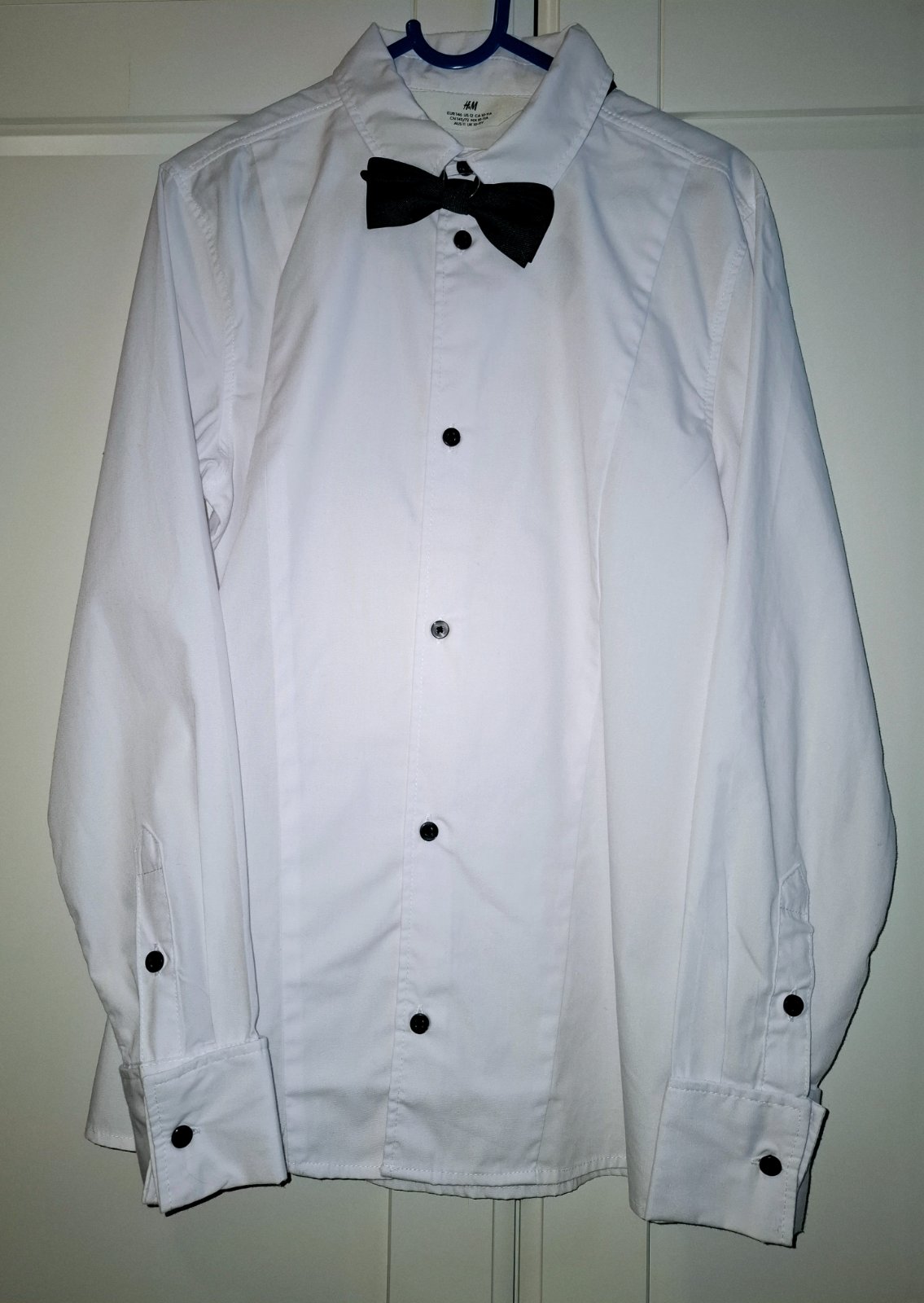 Elegantná slávnostná košeľa oblečená len na hodinu, motýlik nepoužitý(syn mal v inej farbe), takže v top stave. Velkostne sedí podľa štitka na košeli. Kúpená za 23,99€. Cena+poštovné