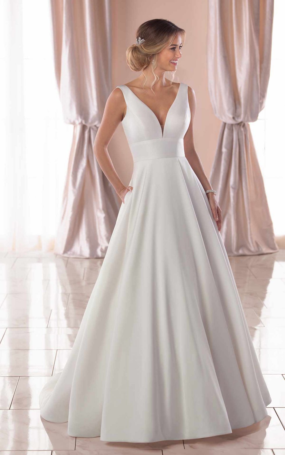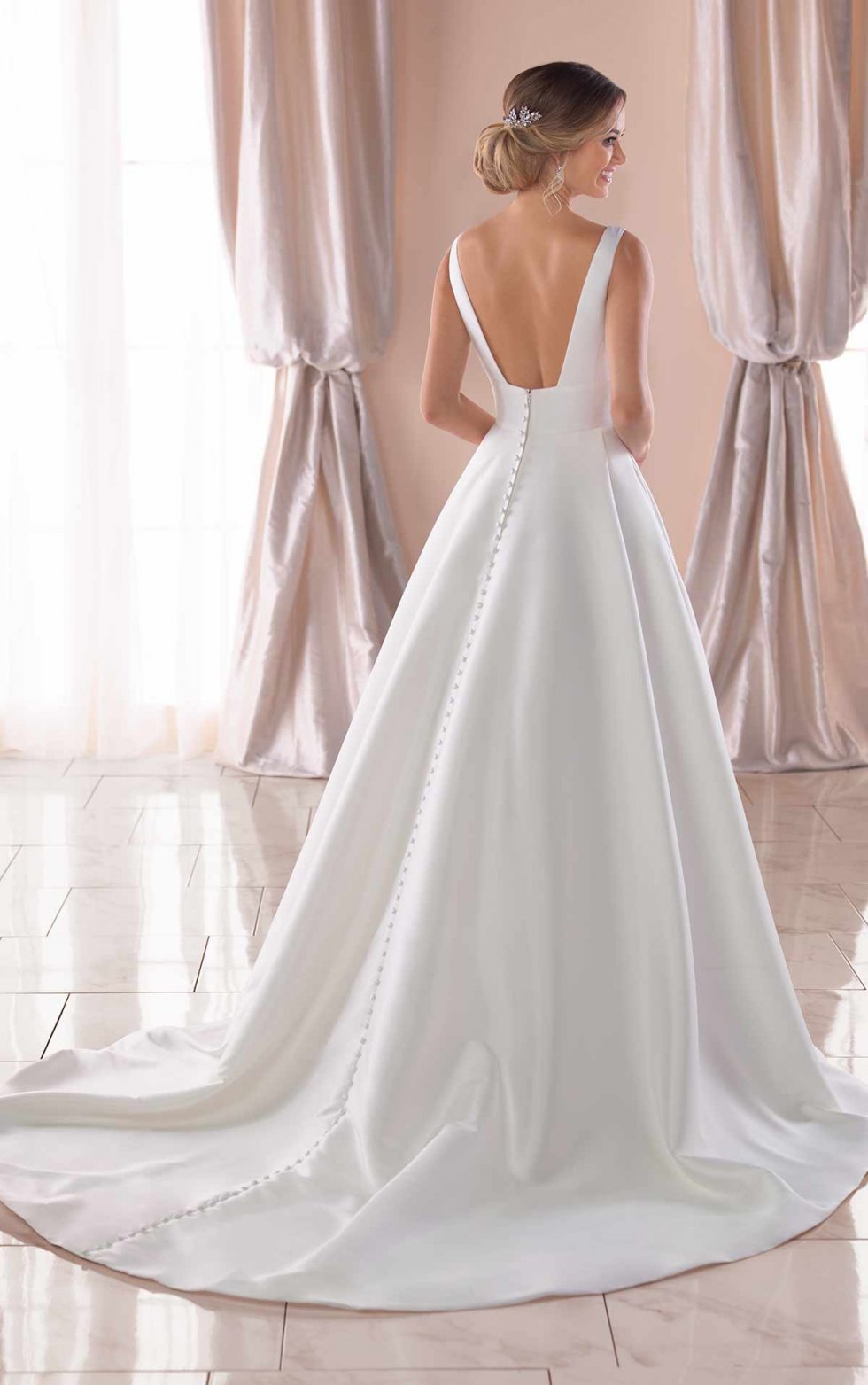 Predám nádherné svadobné šaty, ktoré sú rovnako nadčasové ako láska sama. Šaty sú od návrhárky Stelly York. Sú vyrobené z matnej látky mikádo, majú moderný empírový pás a otvorený štvorcový chrbát. Primerané nariasenie v sukni umožňuje, aby si udržala okrúhly tvar. Zozadu na šatách od výstrihu po koniec vlečky šiat sú umiestnene látkové gombíky a moderny nádych dotvárajú vrecká. Veľkosť siať je 38. Minimálne upravované. Vhodné aj pre vysoké ženy. Vlečku je možné priviazať zospodu k šatám.Obrazky siat su pouzite z katalogu.