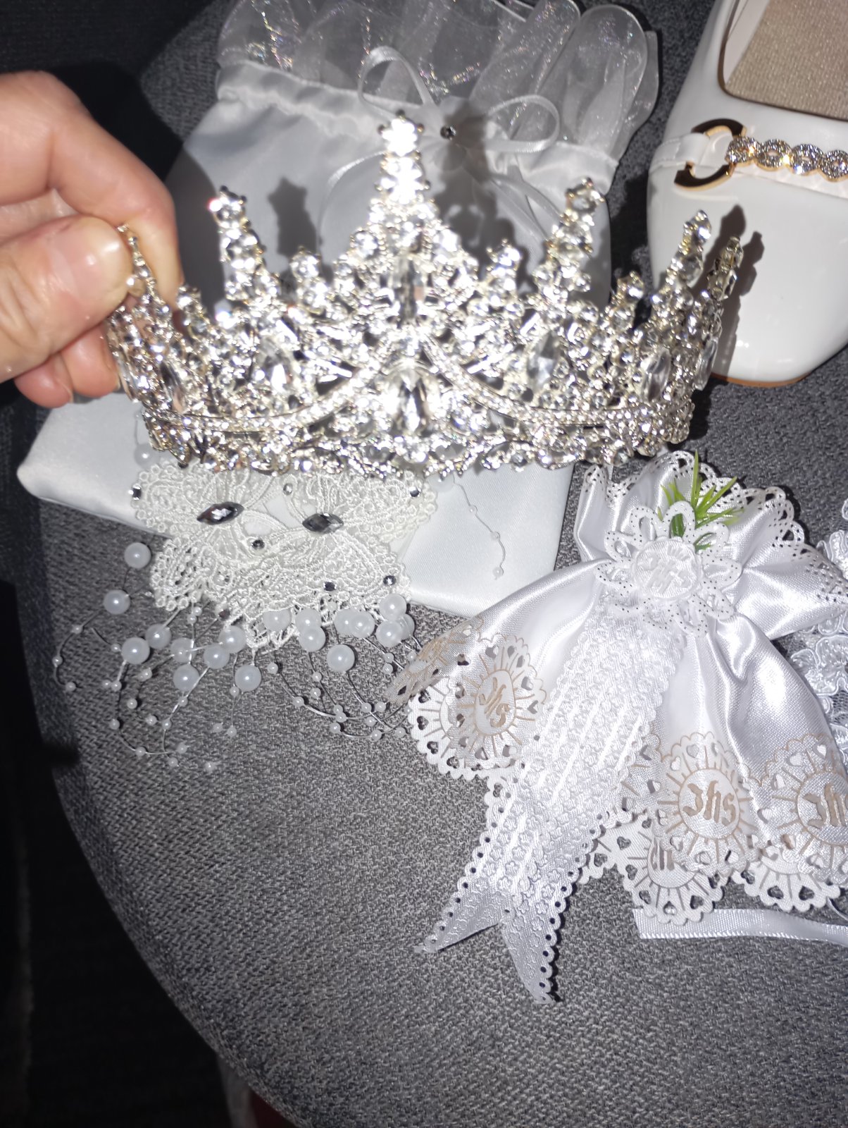 Predám doplnky k šatám vhodné na PSP ,topánky sú nové akurát ich mala dcéra po dome ,v predu je taký menší škrabancek .ktorý ani nevidno..korunku mala len v kostole ,aj rukavičky ,spony ani nemala ,