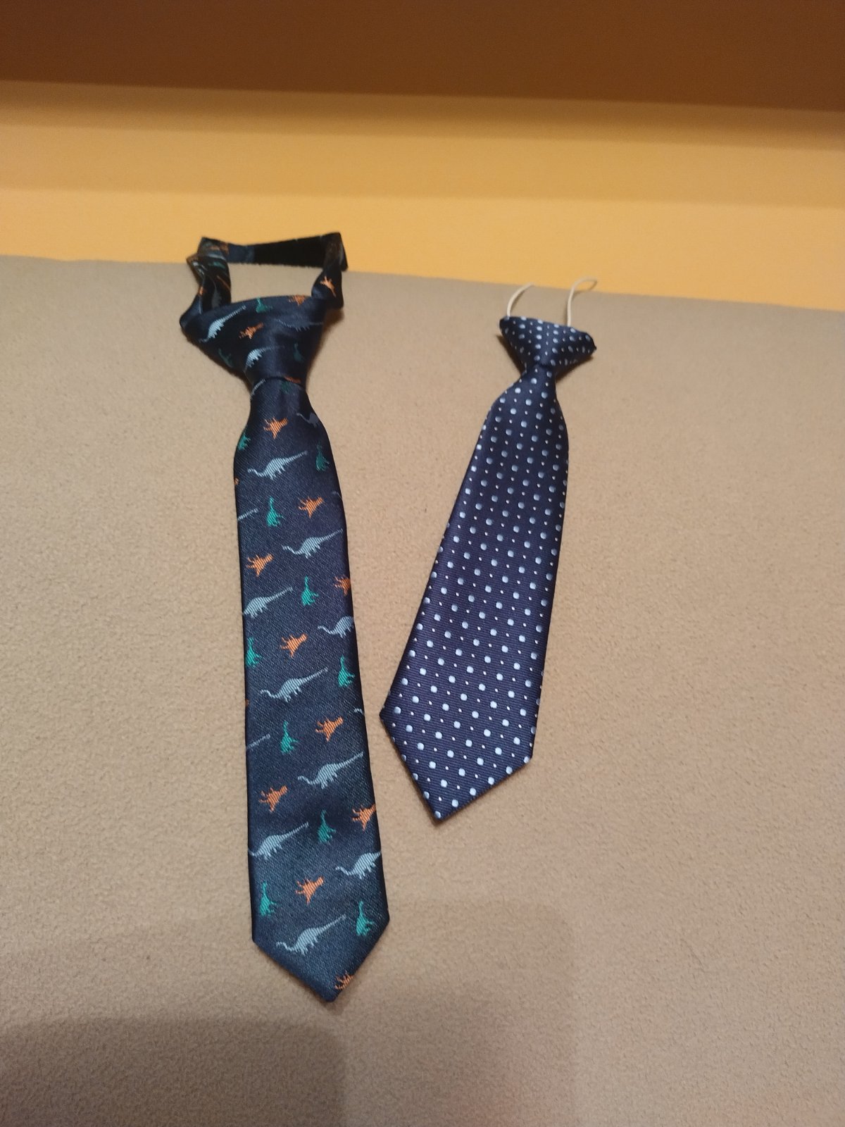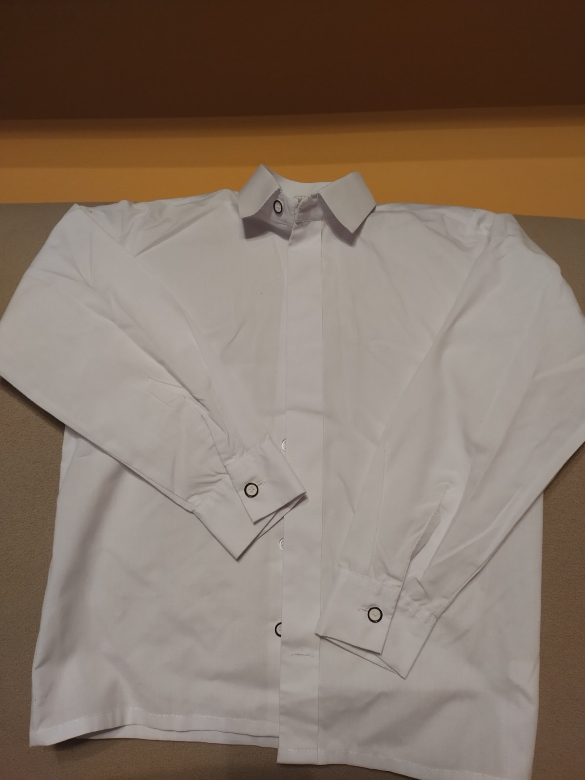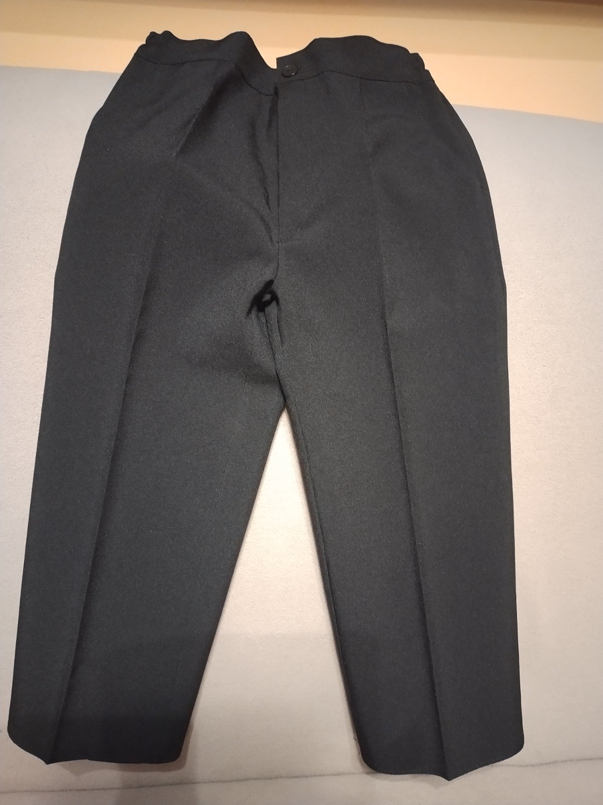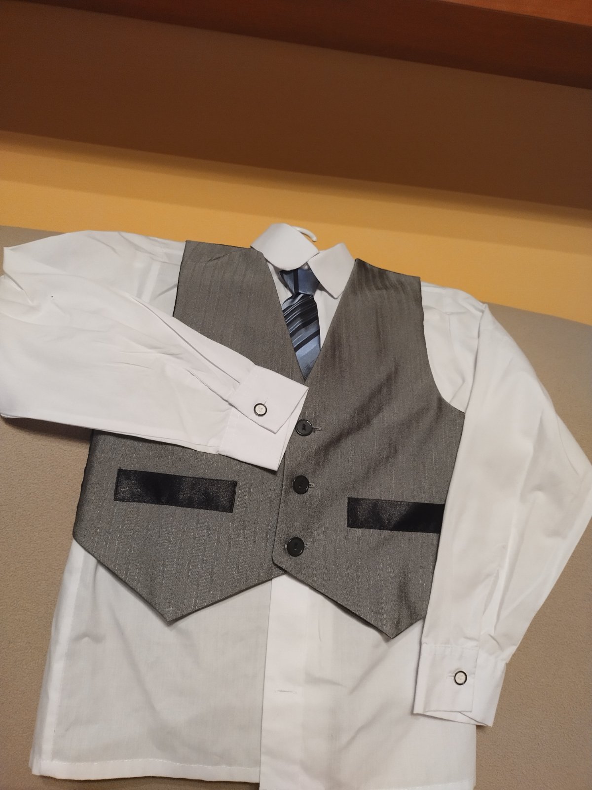 Skladá sa zo šedej vesty na gombíky, bielej košele s dlhým rukávom celkovej dĺžky chrbátika je 50cm, vnútorná dĺžka rukáva je 37 cm a obvod pod rukávmi je 2x37cm, čierne nohavice, zapínajú sa zips a gombík po bokoch je gumička. Celková dĺžka nohavíc je 74cm, vnútorná dĺžka nohavice je 48cm, obvod pása je 2x32cm . Sú k tomu aj tri tmavomodré kravaty