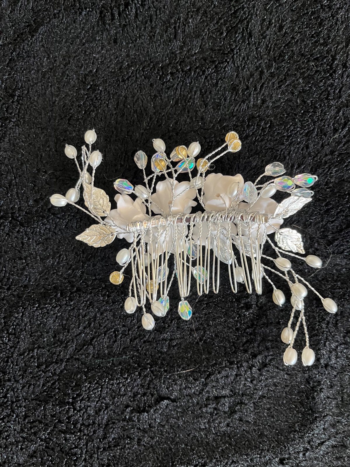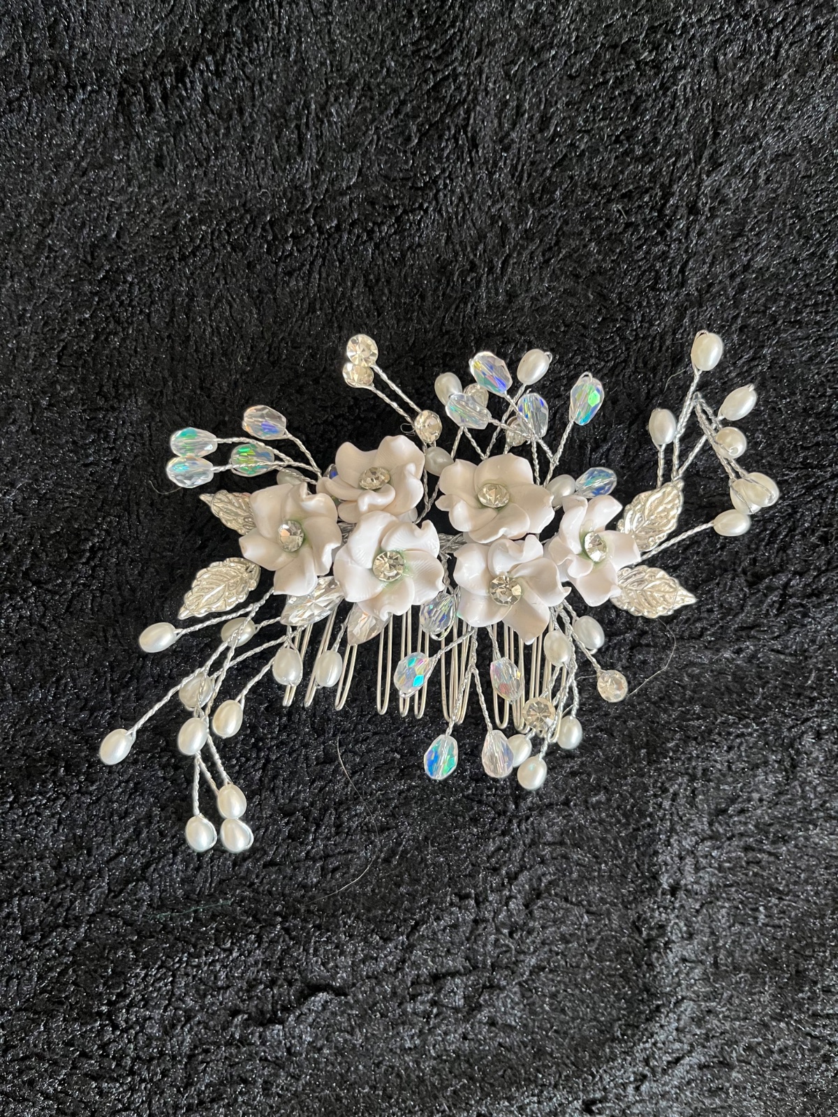Elegantný biely fascinátor zdobený jemným bielym tylom a krémovými perličkami. Dominantný je jeden výrazný tylový kvet doplnený niekoľkými menšími kvietkami s perličkami, ktoré dodávajú ozdobe roma...