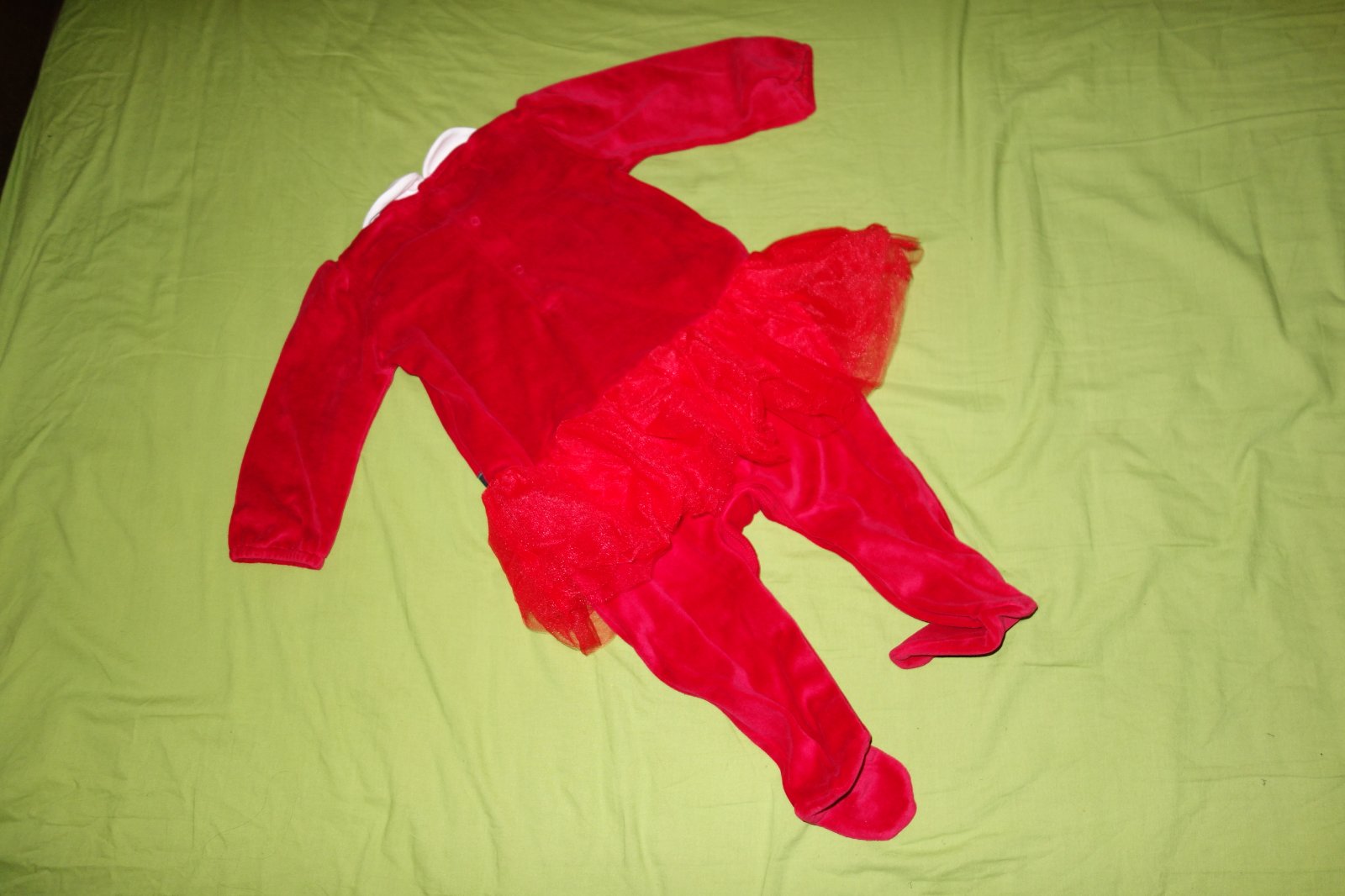 Krasny vianocny kostymcek- novy, s visackami. Ma tylovu suknicku. Je velurovy. Medzi nozkami sa rozpina na cvocky.