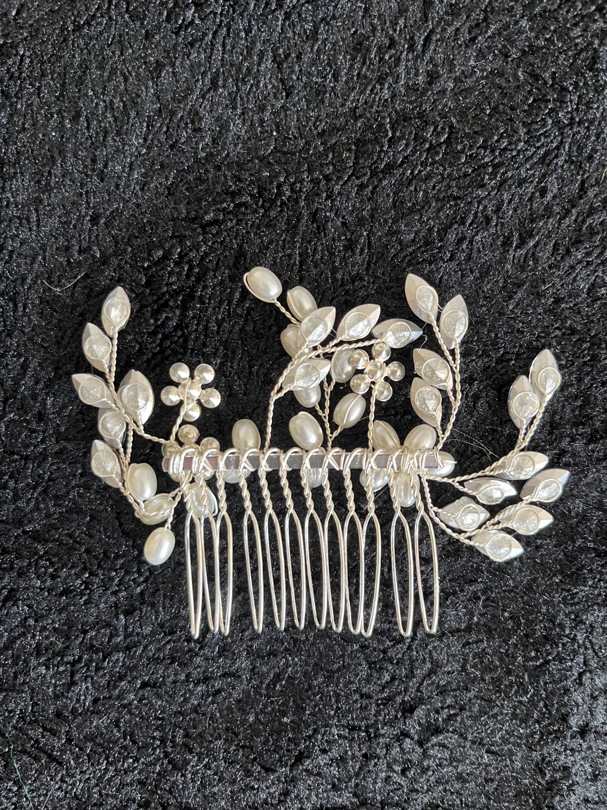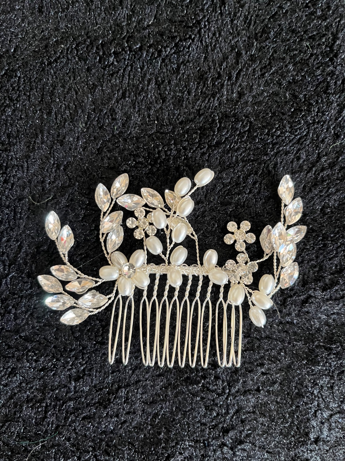 Elegantný biely fascinátor zdobený jemným bielym tylom a krémovými perličkami. Dominantný je jeden výrazný tylový kvet doplnený niekoľkými menšími kvietkami s perličkami, ktoré dodávajú ozdobe roma...