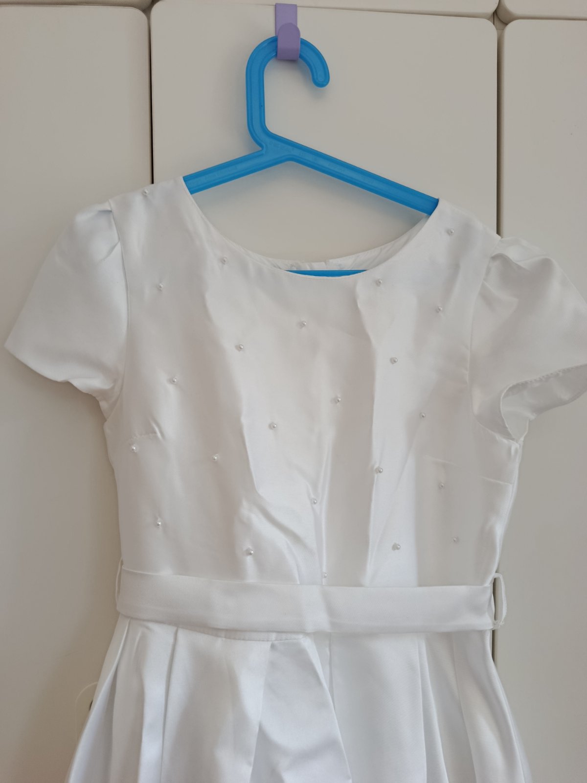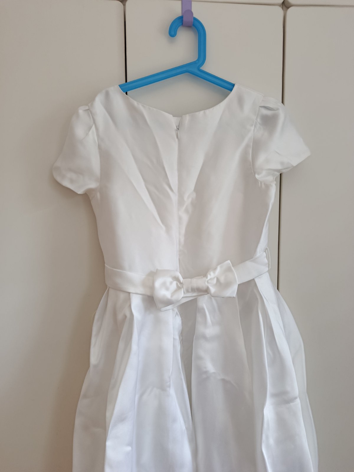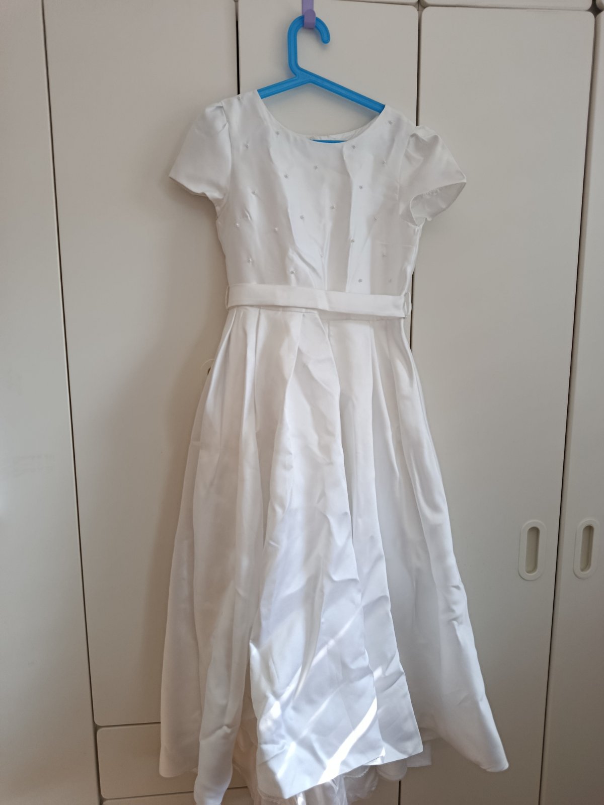 Predám šaty na 1. Sväté prijímanie po mojej dcére kúpené 03/2025 na stránke next. Materiál je hrubší satén, pekne vytvarovany driek vďaka opasku. Spredu sú kratšie, aby pri chôdzi nezavádzali a vytvárajú vzadu miernu vlečku, dekolt je jemne dozdobeng perličkami. PC 98€ cena bez poštovného