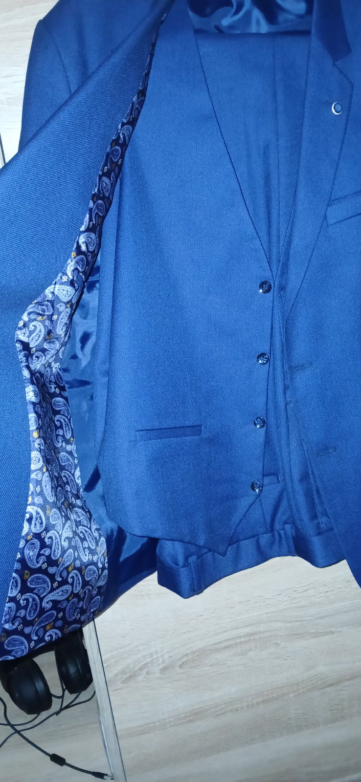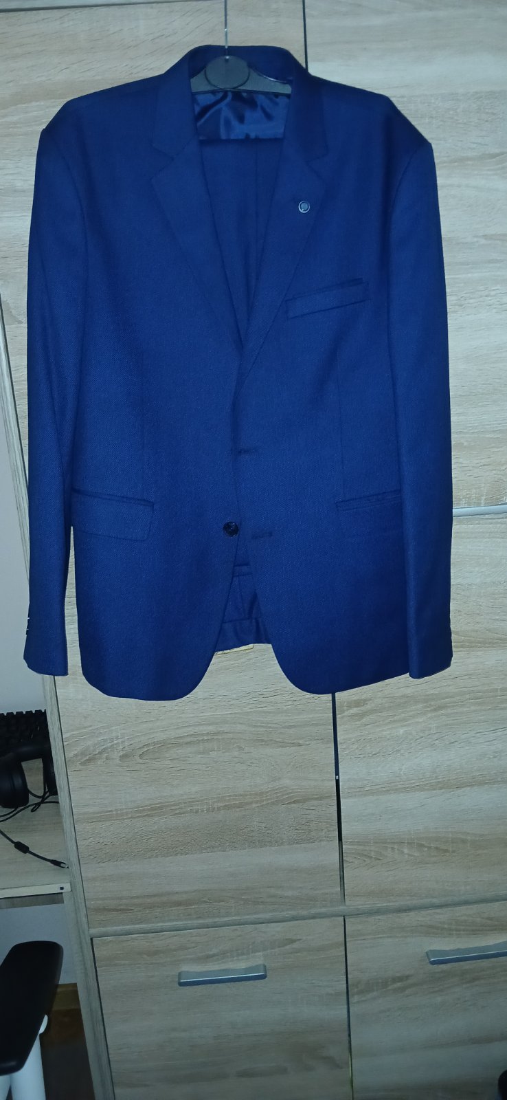 Predám kvalitný panský oblek.3krát oblečený.Mam k nemu aj bielú košelu na manžetové gombíky.Oblek pozostáva zo saka,nohavýc a vesty.Jedna malá chybička,že syn stratil gombík z nohavýc tak Som tam prišila iné.