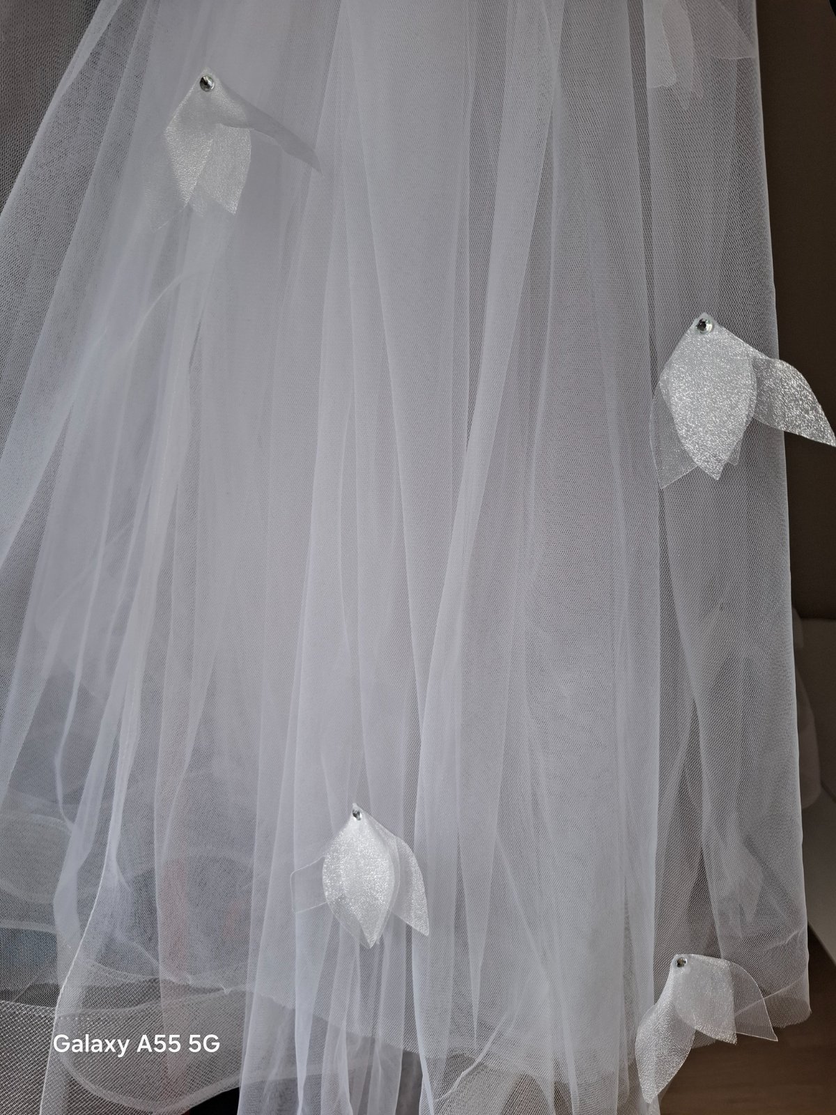 Krásne snehobiele šaty. Site vo svadobnom salóne. Vzadu zips aj šnurovanie