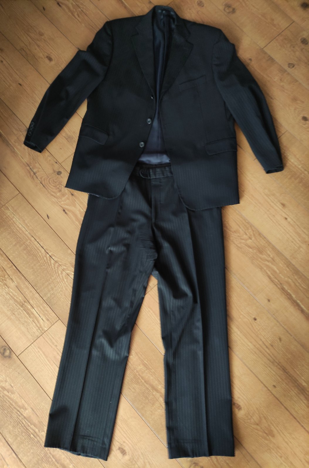 Ponúkam jeden krát oblečený pánsky oblek, čierny s jemným pásikom, na výšku 182, váhu cca 85 kg. Pás 88 cm, dĺžka nohavíc 108 cm.