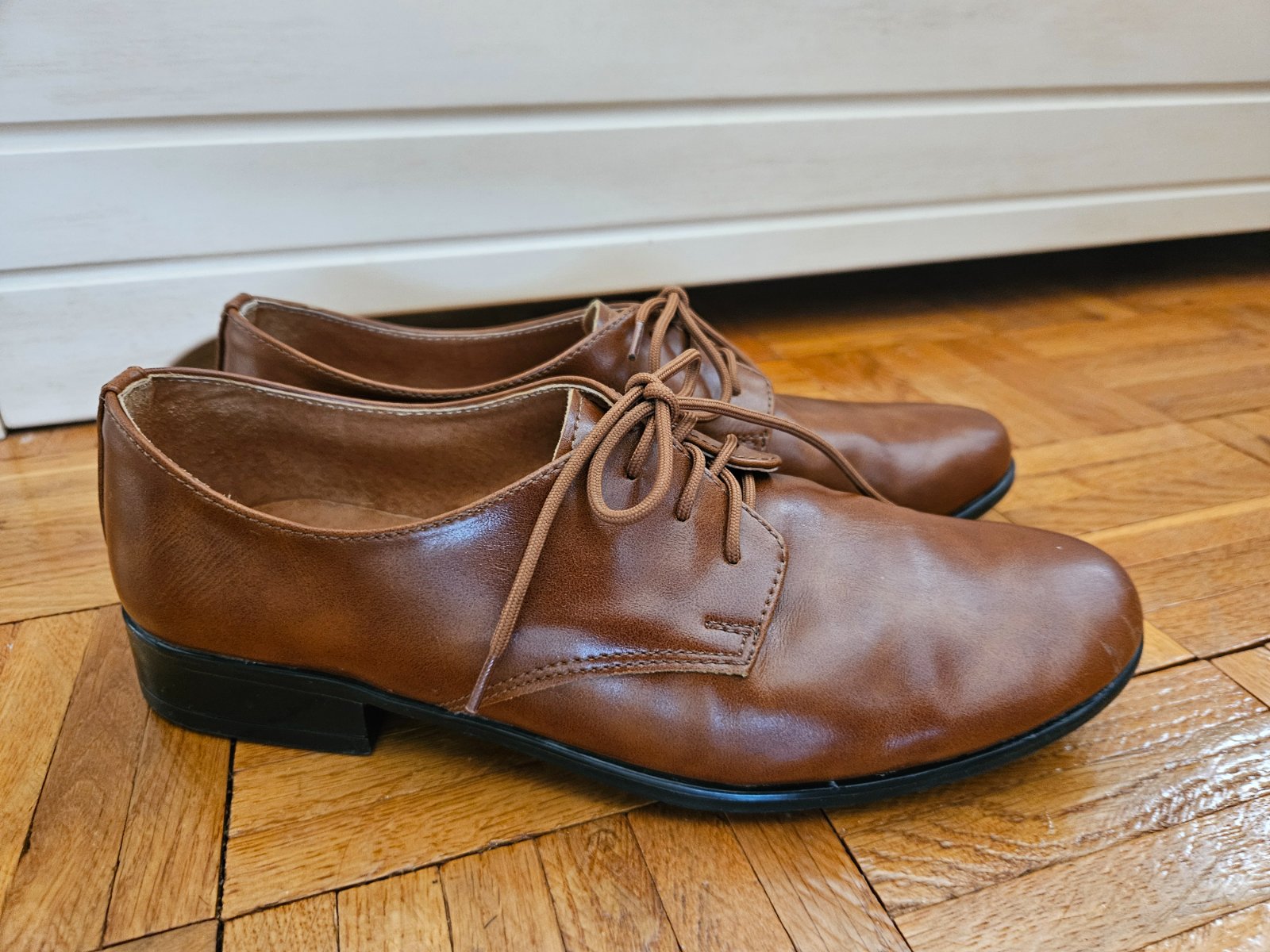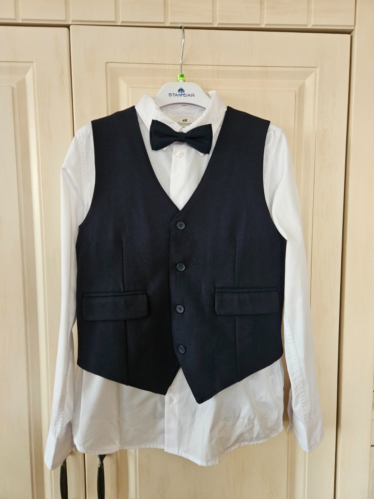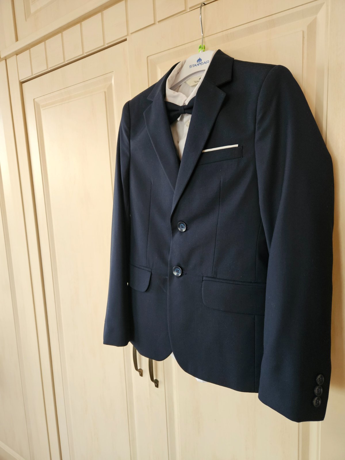 Predam spolocensky oblek tmavomodrej farby na 1.sv.prijimanie pre chlapca. Set obsahuje sako, nohavice, vestu, bielu koselu, tmavomodreho motylika, hnedy opasok, velkost 140, cena 70 eur. K obleku su k dispozicii aj hnede topanky vel.35. Vnutorna velkost chodidla je 24 cm, cena 15 eur. Osobny odber.