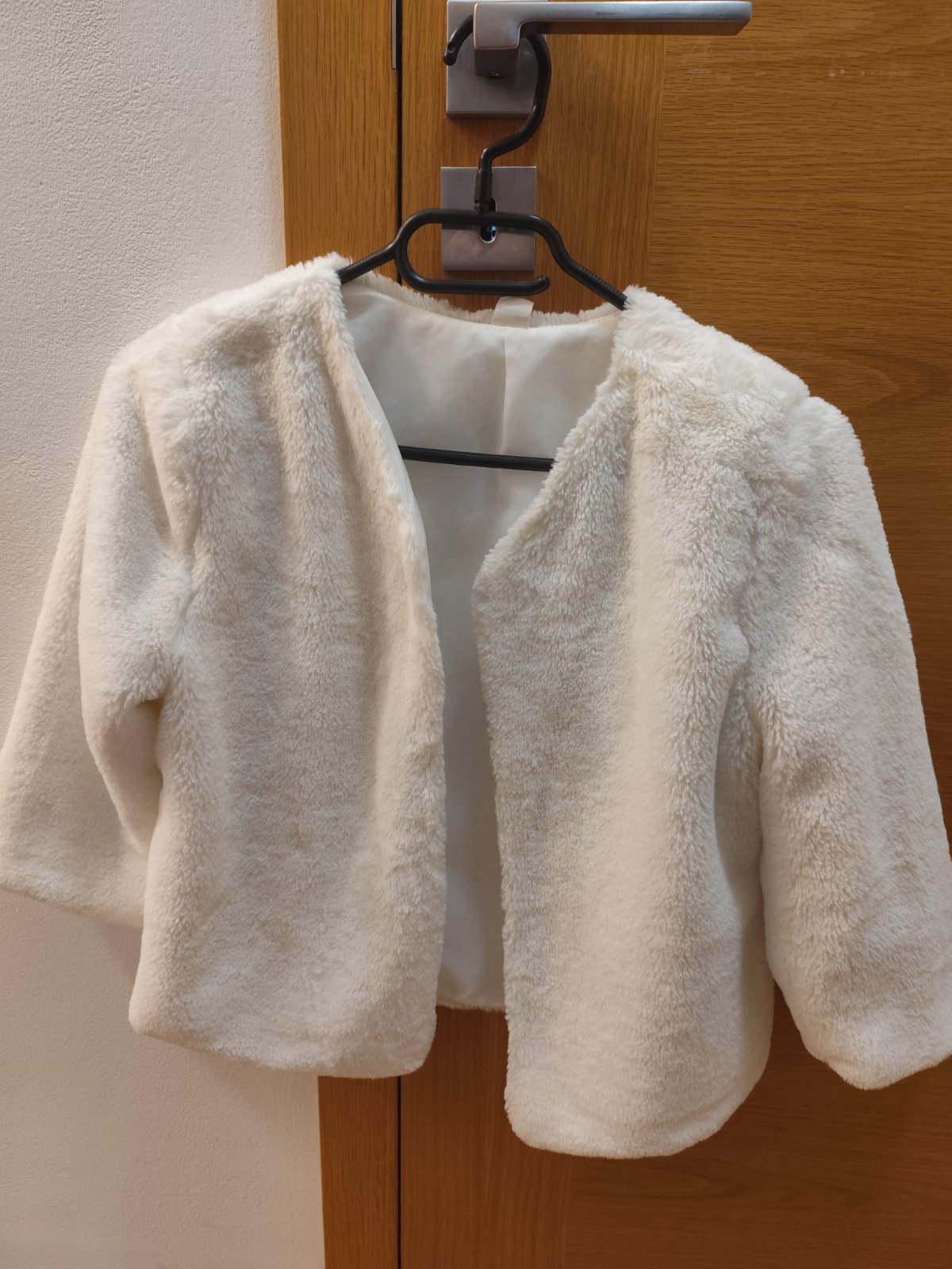 Predám krásne biele huňaté bolerko vhodné na svadbu alebo oslavu. Bolerko má 3/4 rukávy, veľkosť 40, použité 1x. Veľmi dobrý stav.
