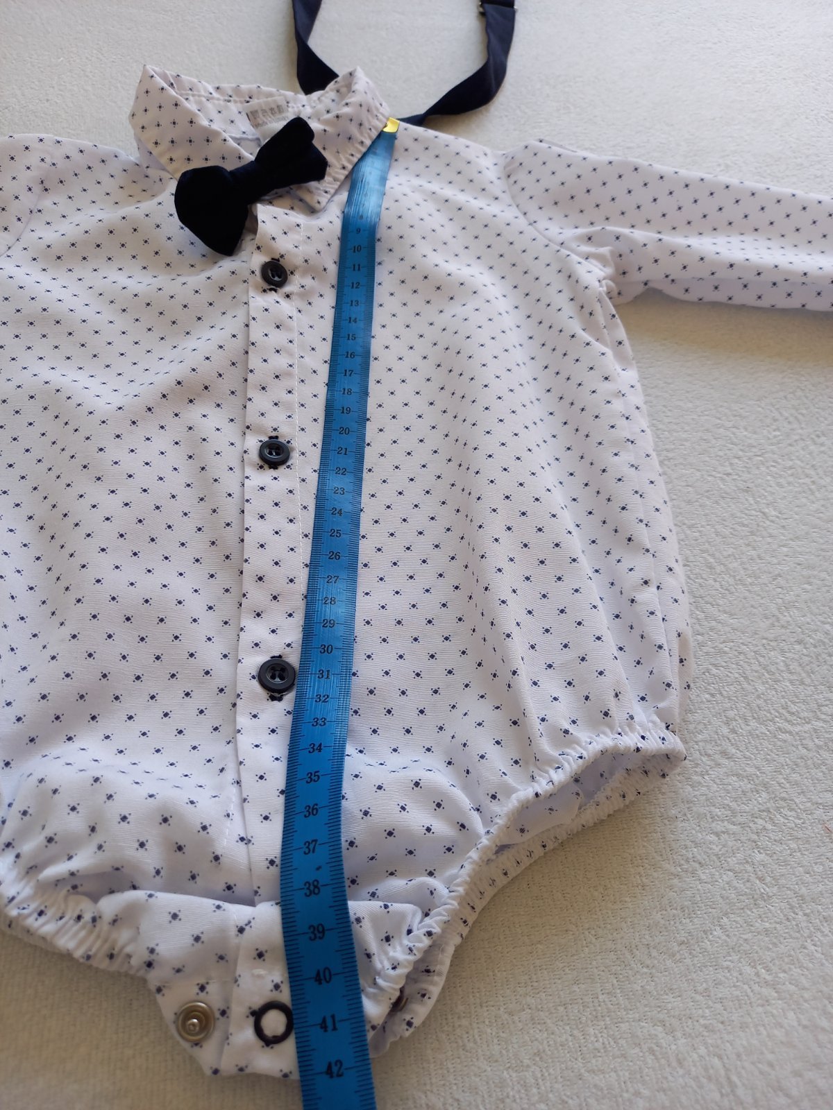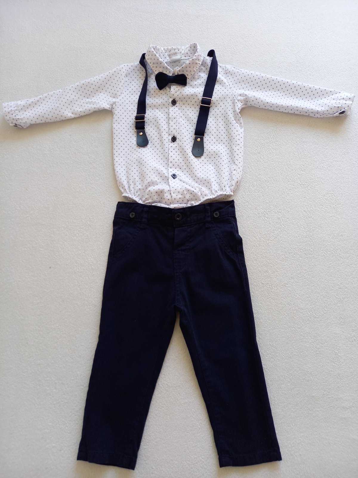 Oblečenie na krst Roman Prekrásny kompletík do krstu Roman. Komplet obsahuje: - biele košeľobody - tmavomodré nohavice - štýlové traky - biela čiapočka - bodkovaný motýlik Košeľobody má v...