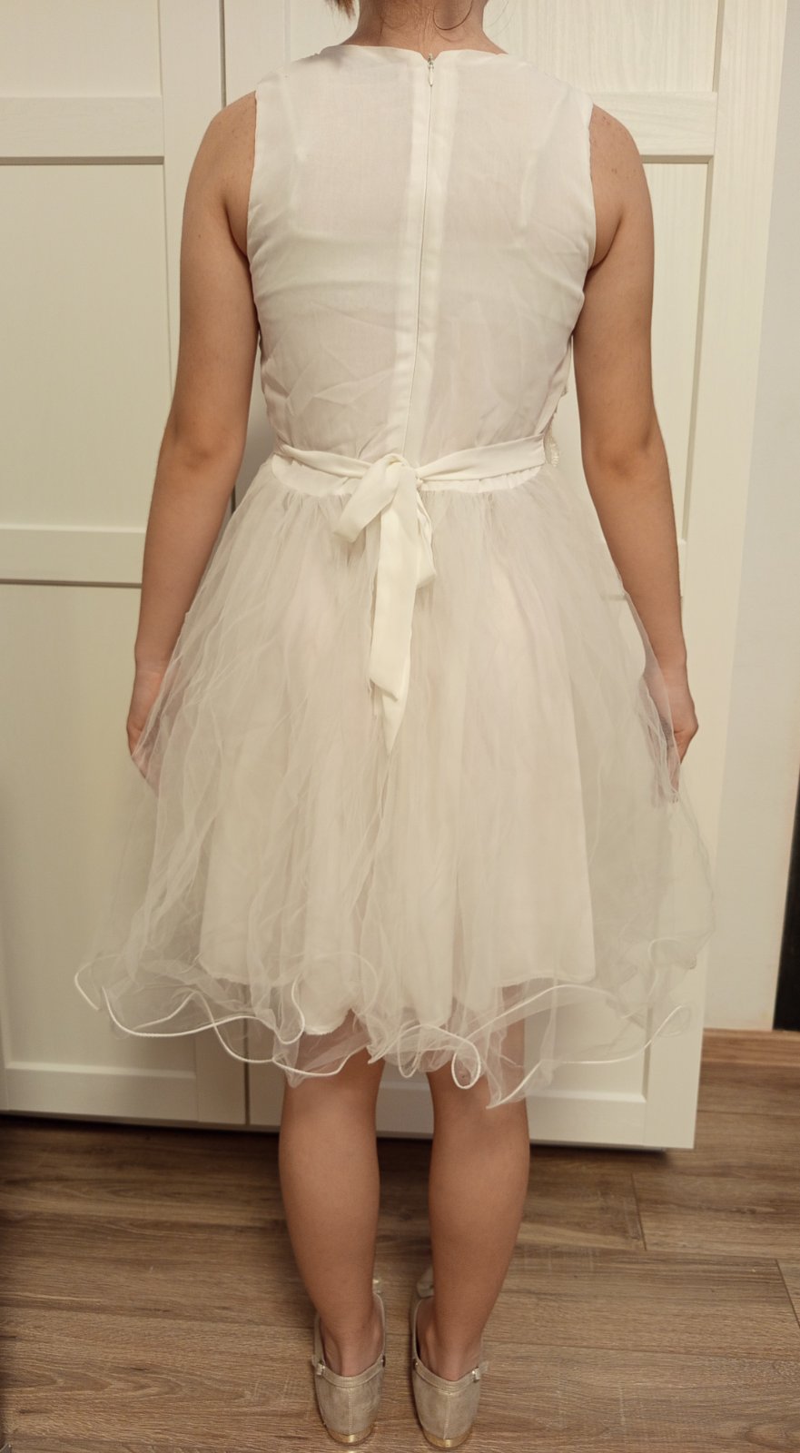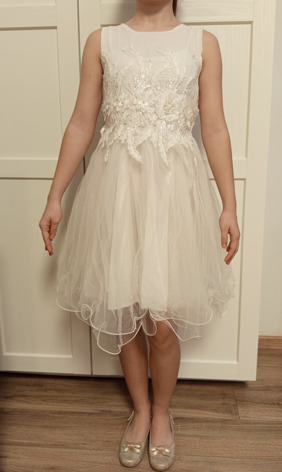 Šaty na prijimanie s 3/4 rukávmi Nové Veľkosť 11-12y, 150 Rozmer celková dlzka101 cm šírka pod pazuskami je 36-37 cm Malé zatrhnutie vedľa zipsu, zohľadnené v cene. Možnosť dokúpiť doplnok do vlas...