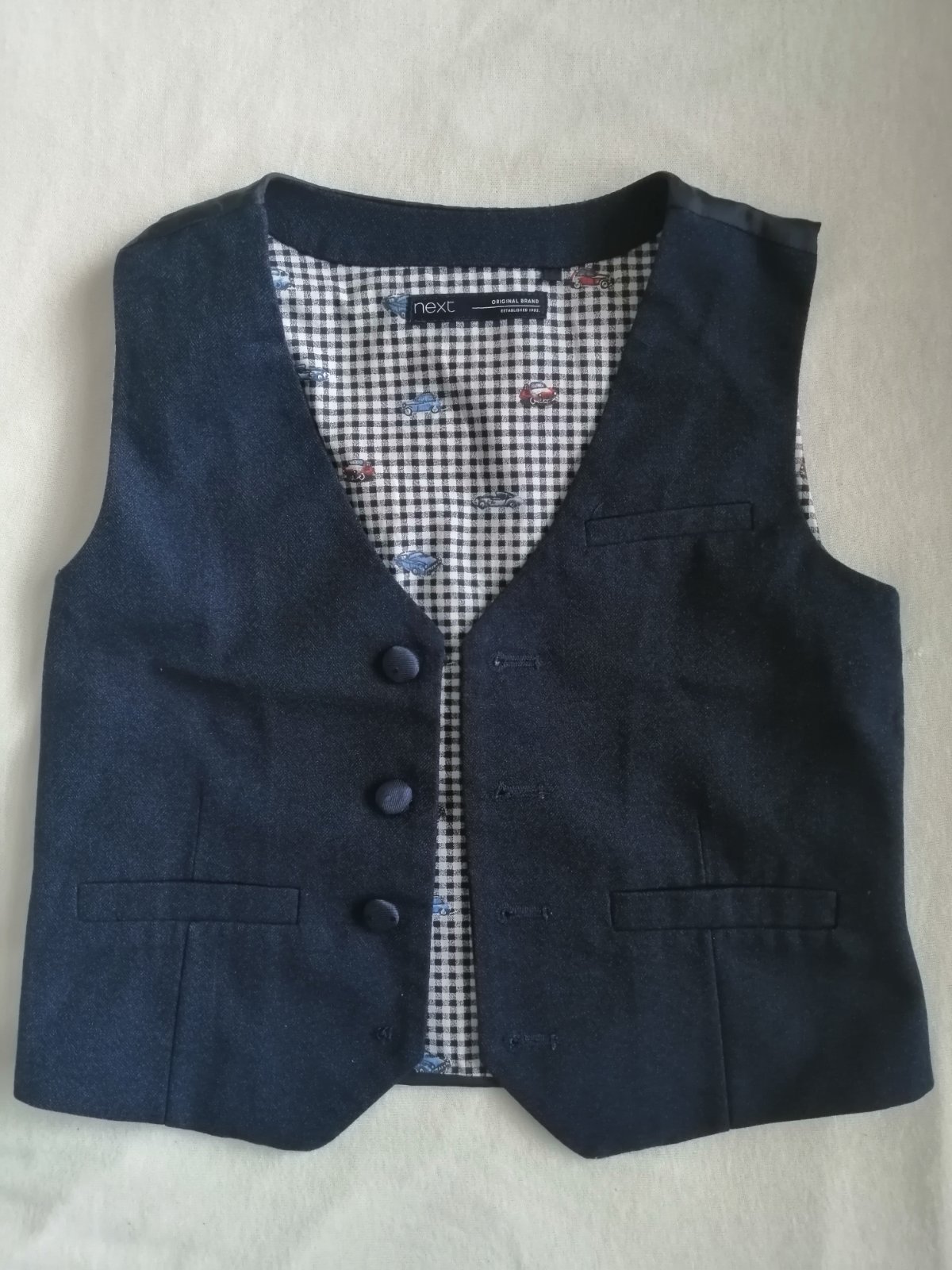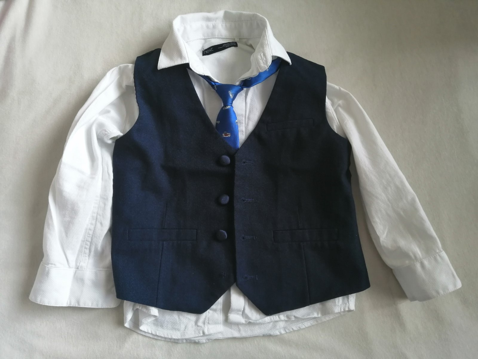 Predam slavnostny komplet (vesta, kosela, kravata) zn. Next, v. 104 (3-4 roky) za 17 eur. Bol 2x obleceny, je vo vybornom stave, len na veste chyba 1 gombik.