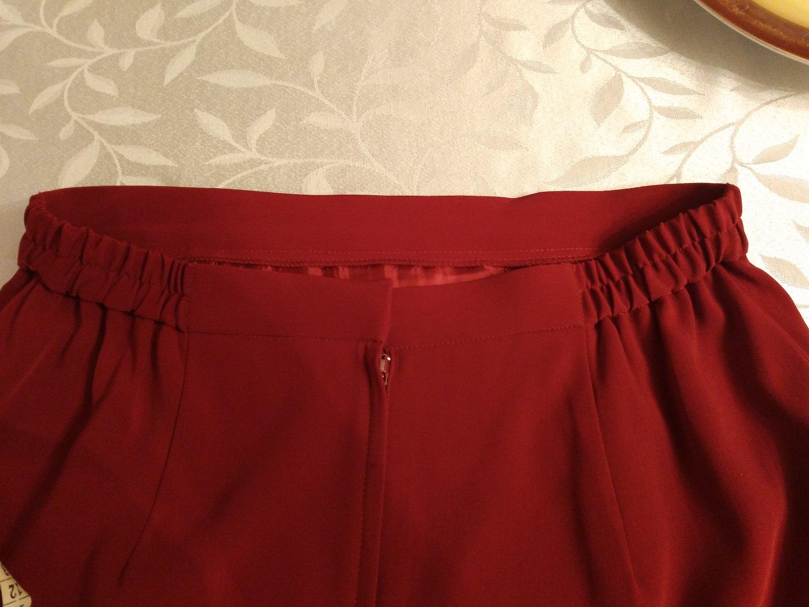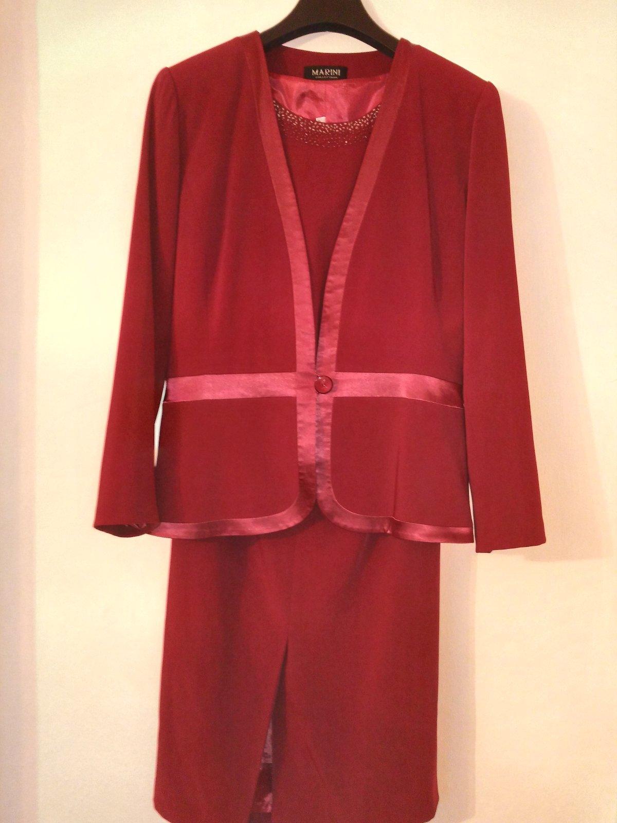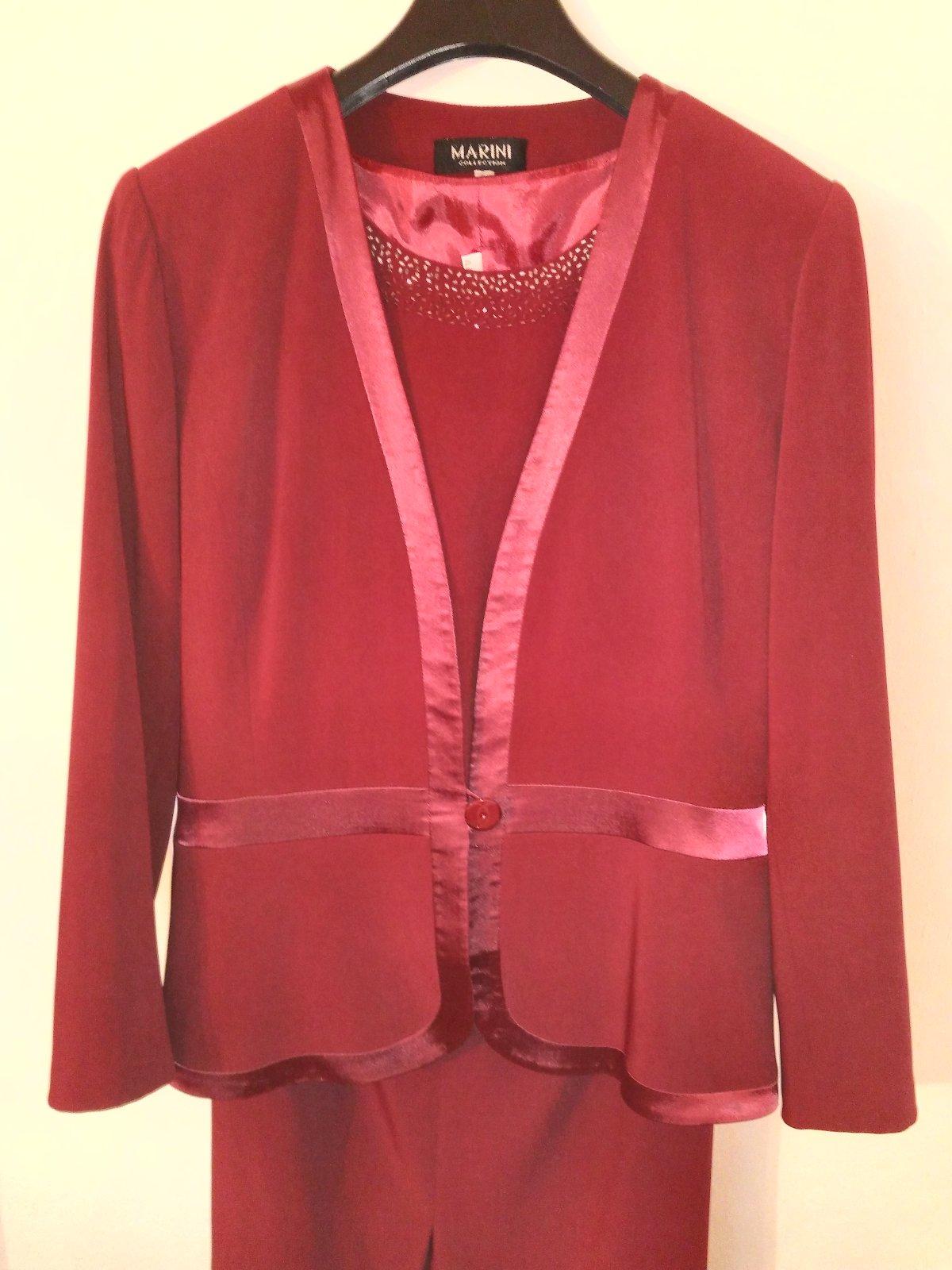 Kostým pre svadobnú maminu. Skladá sa z dlhej rovnej sukne, topu, saká . Pekná farba ako červené víno. Prsia na tope je cca 53-54cm, na saku sa zle meria,lebo je len jeden gombík tak sa to pohybuje podľa toho ako sa sako poskladá,ale 55cm by som povedala. Pás na sukni v kľude 39cm, ale je v zadnej časti na gumu-vid foto dá sa natiahnuť na 46cm. Boky 57 cm.
