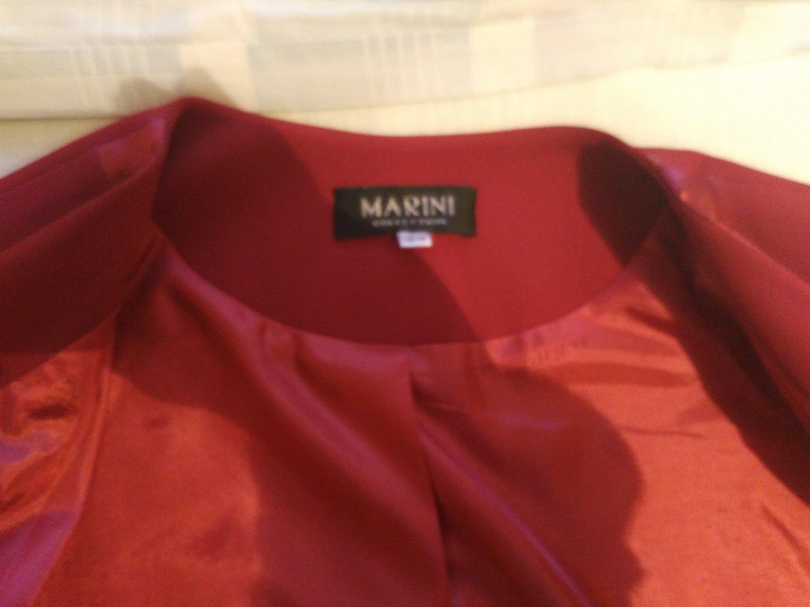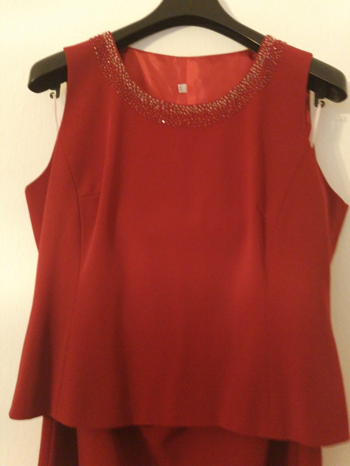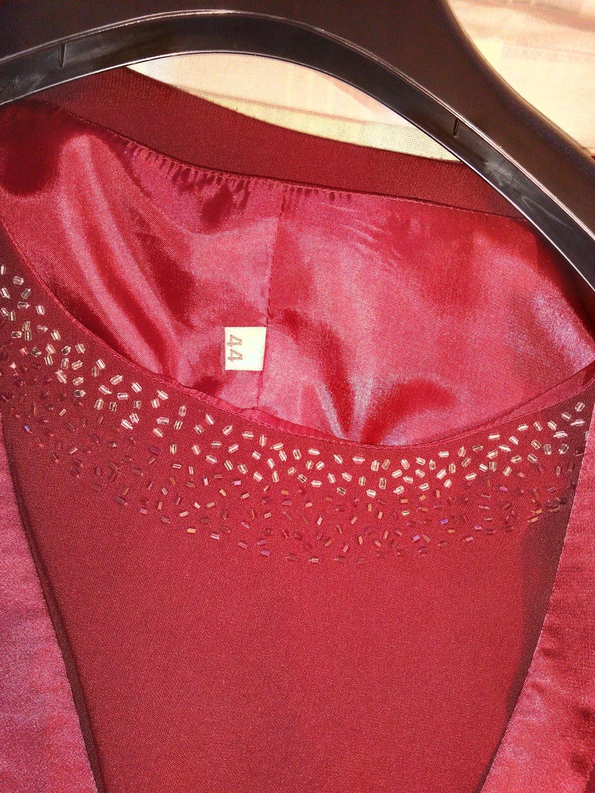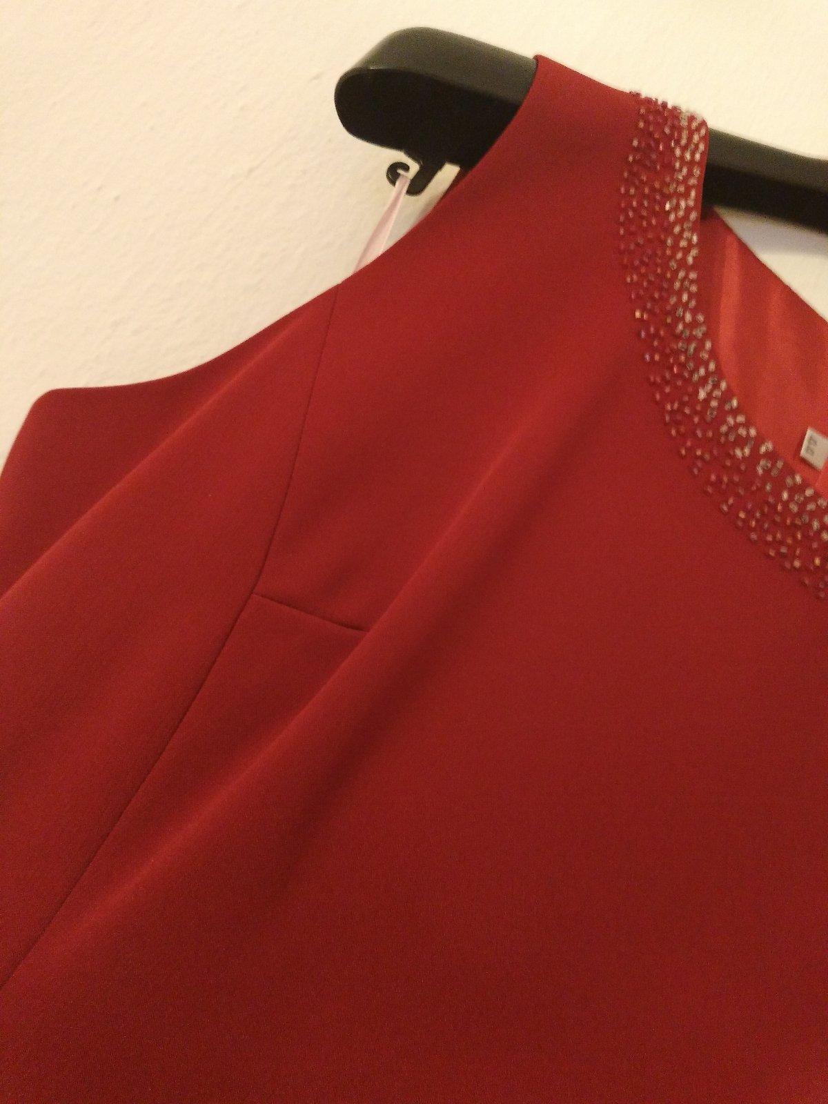 Kostým pre svadobnú maminu. Skladá sa z dlhej rovnej sukne, topu, saká . Pekná farba ako červené víno. Prsia na tope je cca 53-54cm, na saku sa zle meria,lebo je len jeden gombík tak sa to pohybuje podľa toho ako sa sako poskladá,ale 55cm by som povedala. Pás na sukni v kľude 39cm, ale je v zadnej časti na gumu-vid foto dá sa natiahnuť na 46cm. Boky 57 cm.