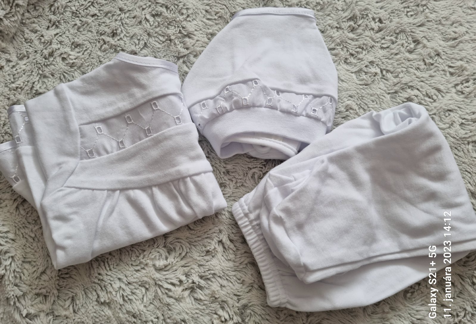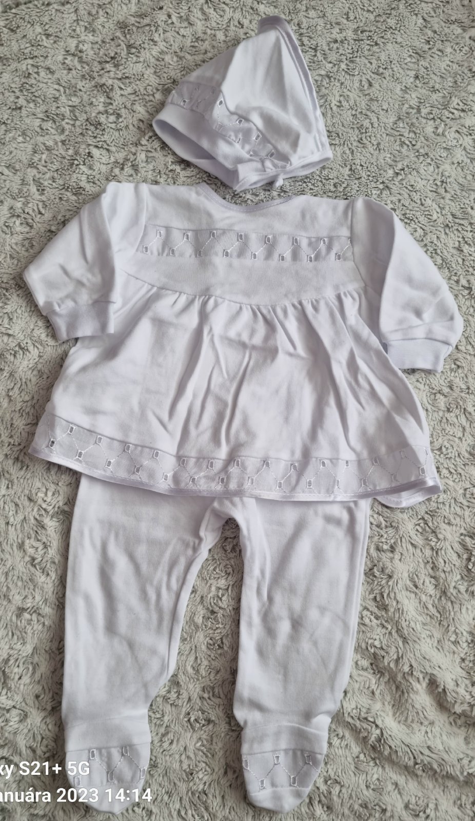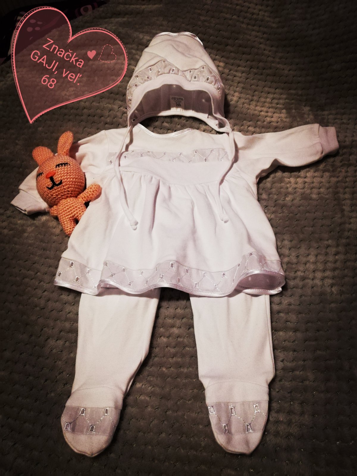 Súprava na krst pre dievčatko, velkosť 68, ale my sme mali oblečené keď sme nosili 74. Súprava bola opraná a oblečená len jeden krát, bez poškodení. Súprava obsahuje reklík, poldupačky a čiapočku. Značka Gaji.