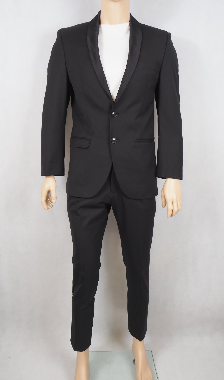 Luxusný pánsky oblek so saténovou fazónou a bočným pásikom na nohaviciach, materiál 54% polyester, 44% vlna, 2% elastan, super stav, ako nové.