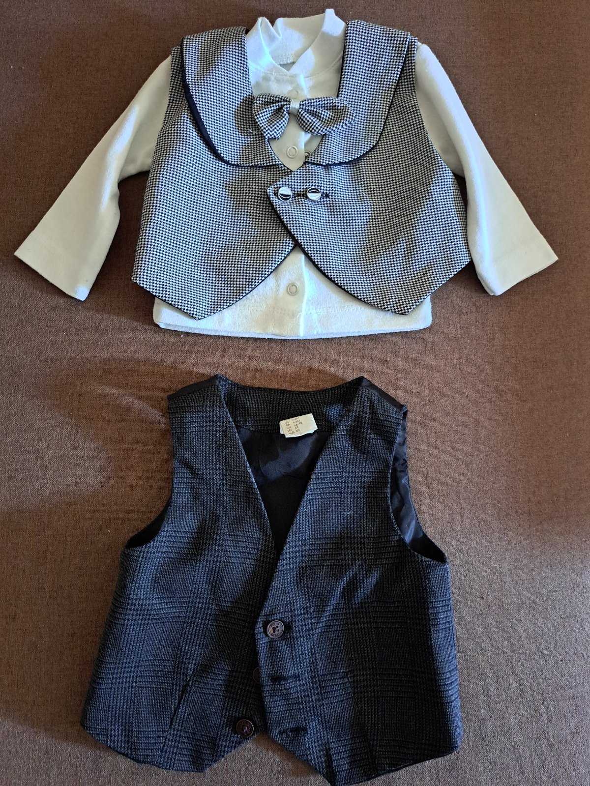 Darujem slávnostné oblečenie pre chlapca, to vrchné je asi 62, vesta 68 velkost. Nám bolo darované, nenosili sme to,, darujeme ďalej