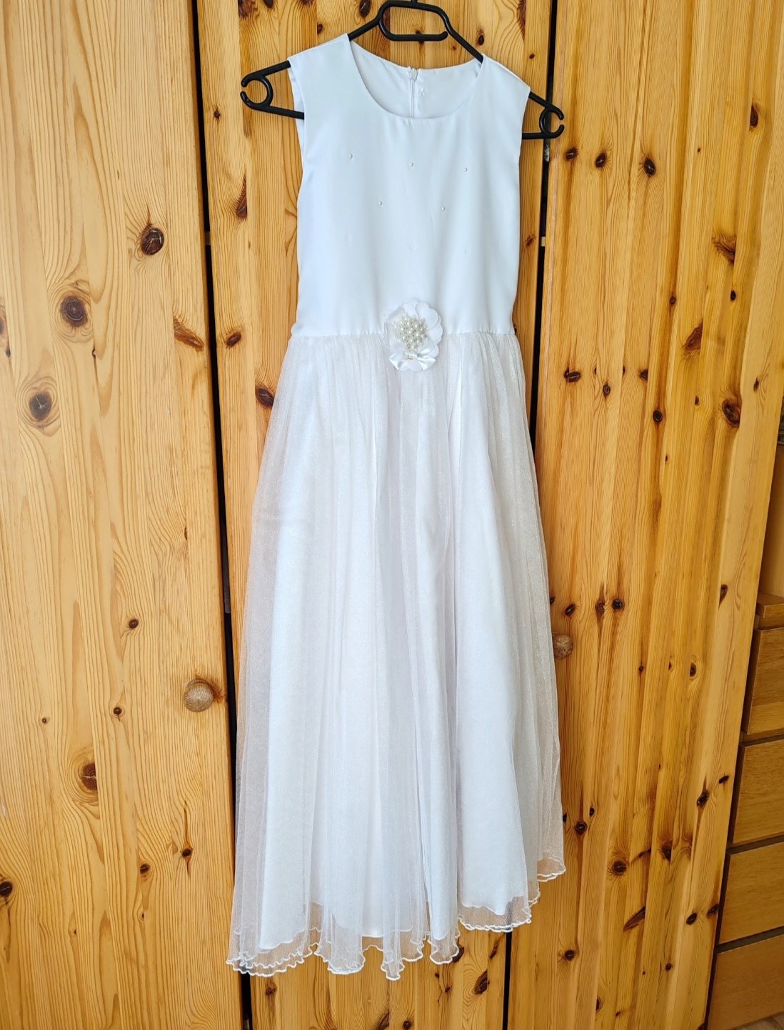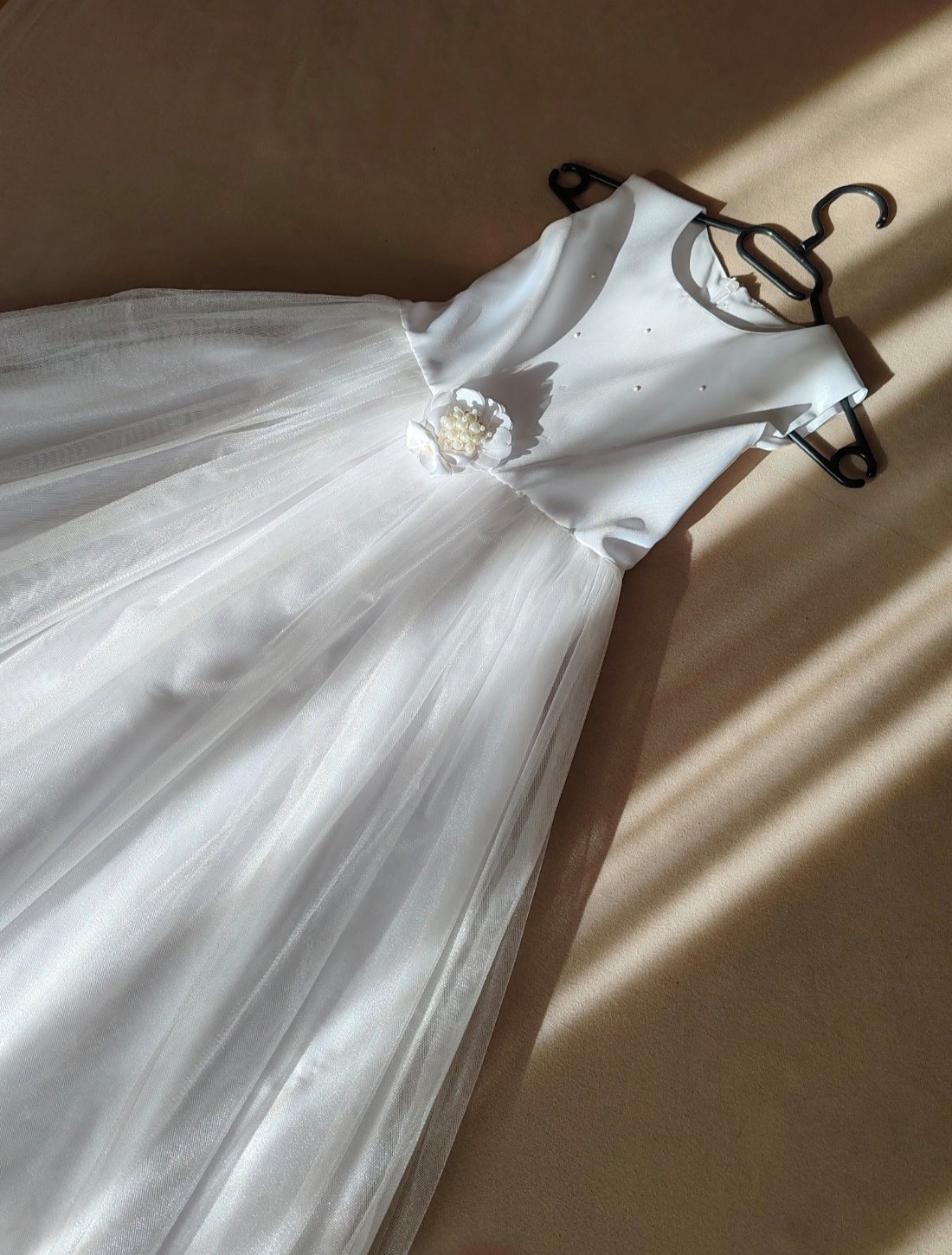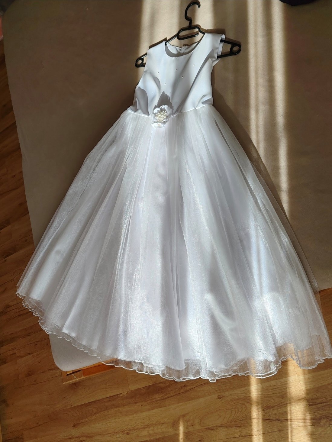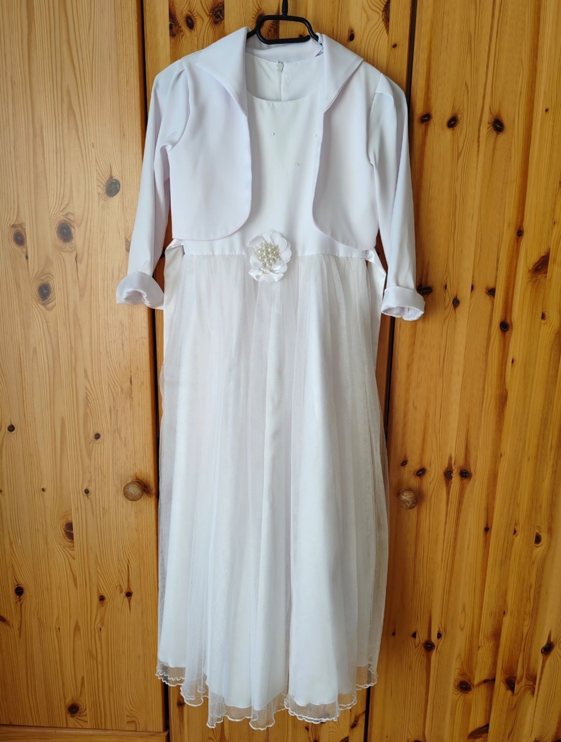 Šaty na 1. sväté prijímanie, plus sačko, oblečené dcérkou 2x. Zospodu troška natrhnutý tyl, nie je vidieť kvôli viacerým vrstvám tylu a pri praní odpadli 3 perličky. Šaty sú vypraté, pripravené ihneď na oblečenie. V prípade záujmu rada premerám.