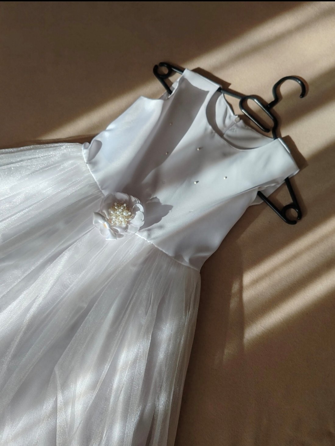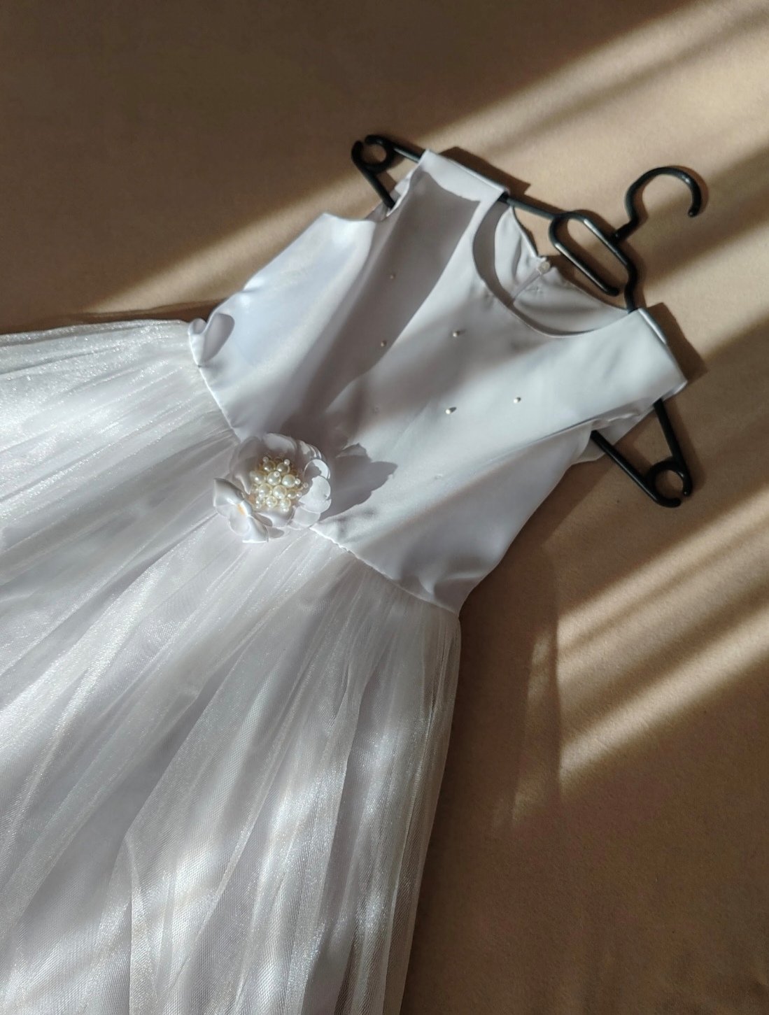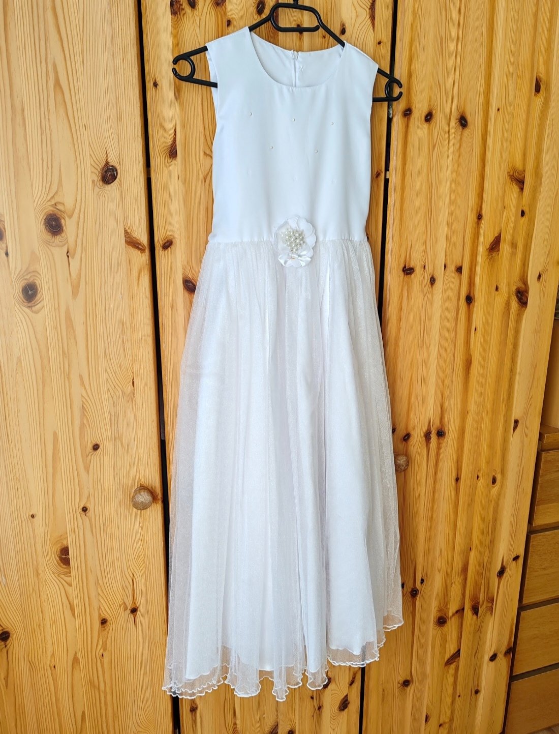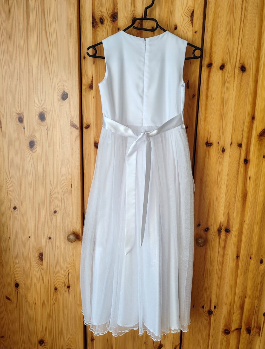 Šaty na 1. sväté prijímanie, plus sačko, oblečené dcérkou 2x. Zospodu troška natrhnutý tyl, nie je vidieť kvôli viacerým vrstvám tylu a pri praní odpadli 3 perličky. Šaty sú vypraté, pripravené ihneď na oblečenie. V prípade záujmu rada premerám.