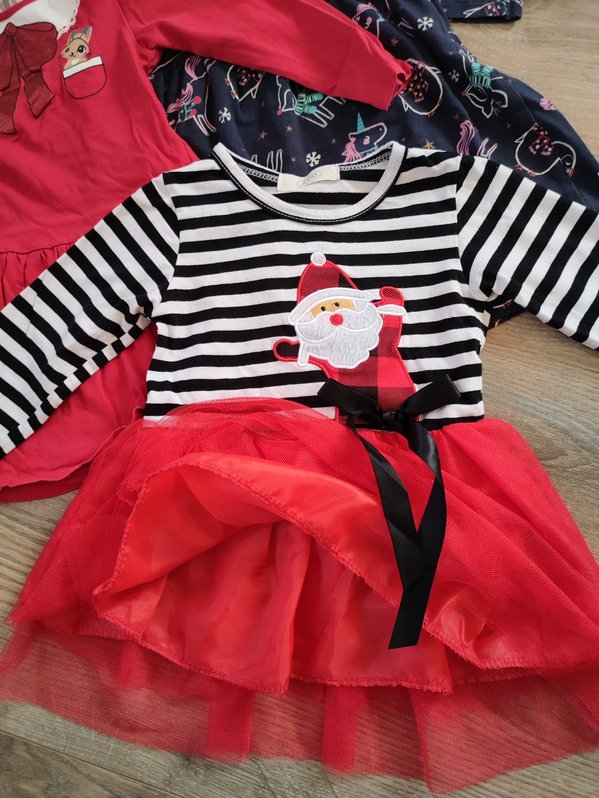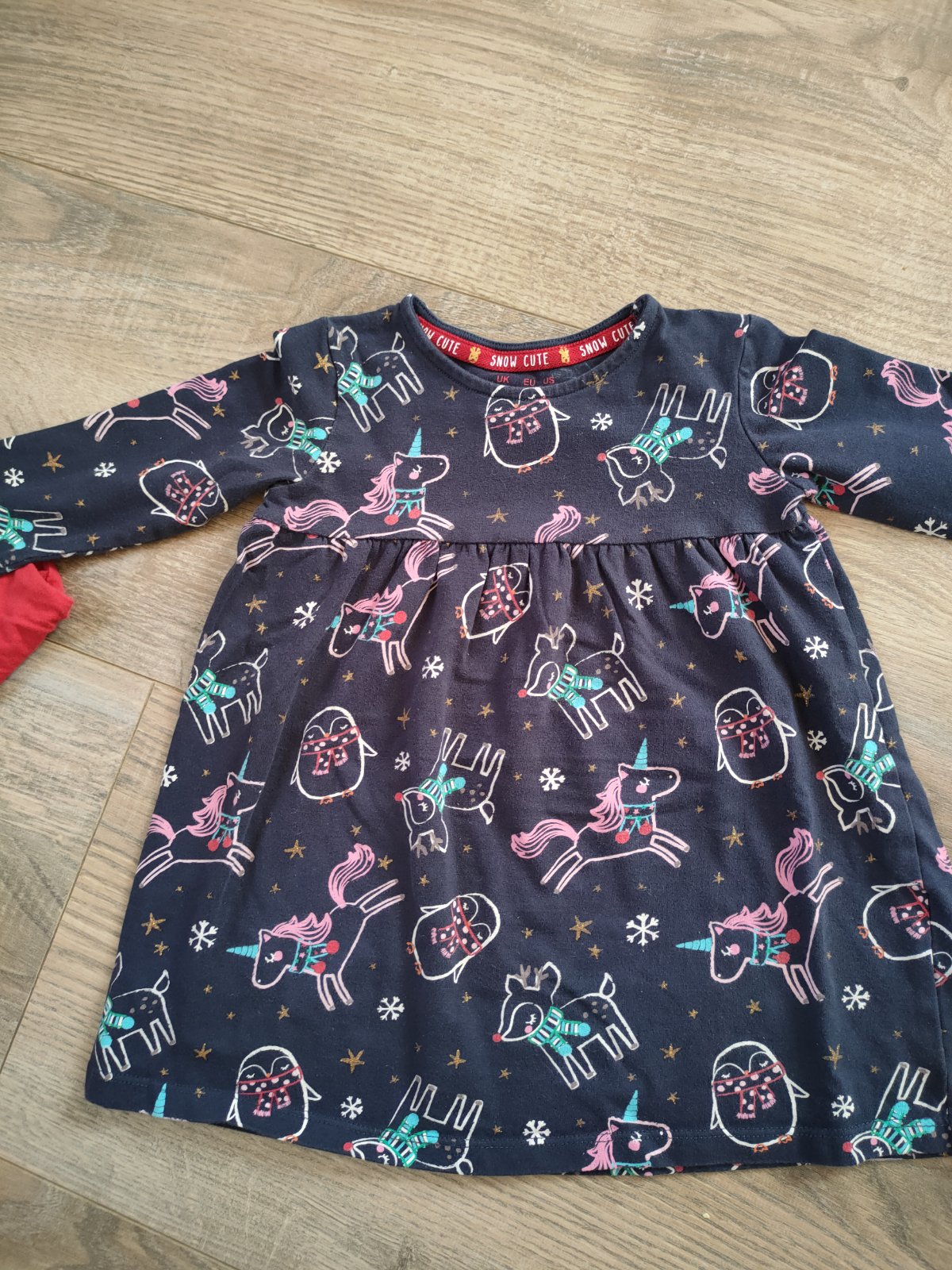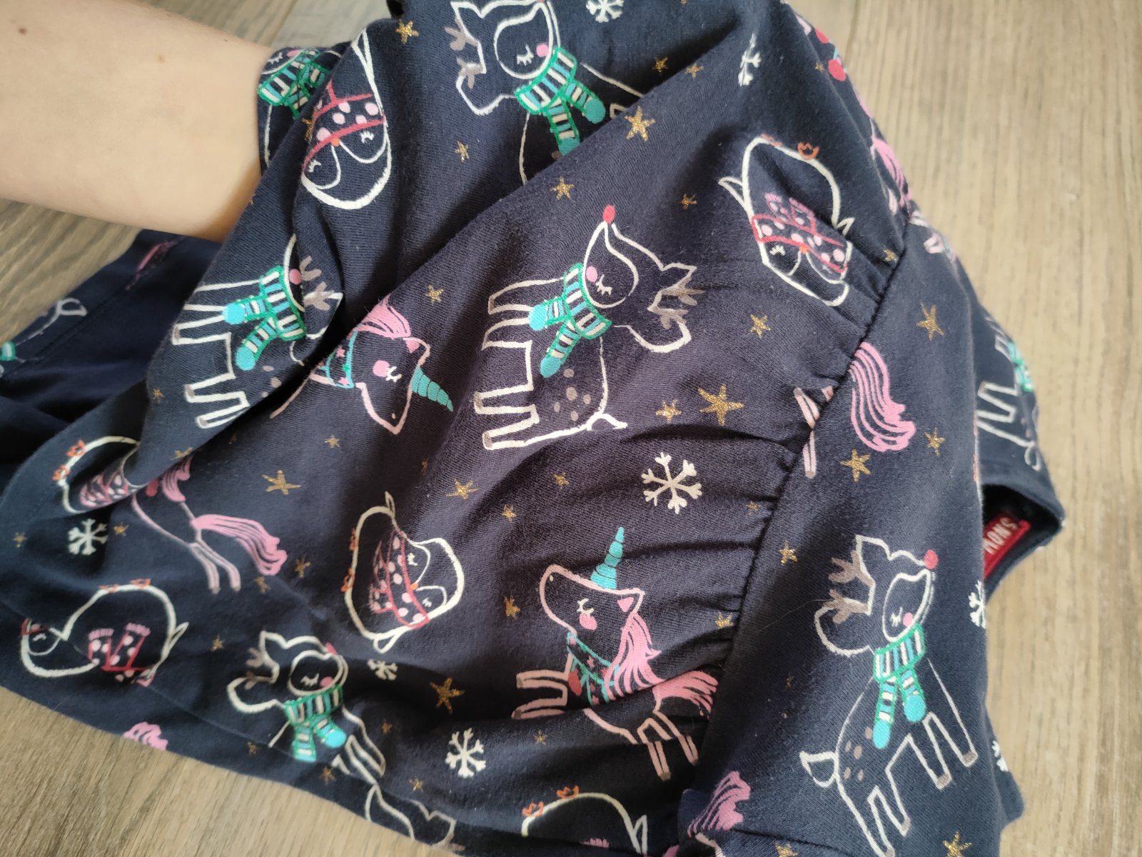 V balíku su veci rôznych značiek: H&M, Next, Sinsay, Pepco... na modrých šatách, tričku a červených nohaviciach chlpok z prania.