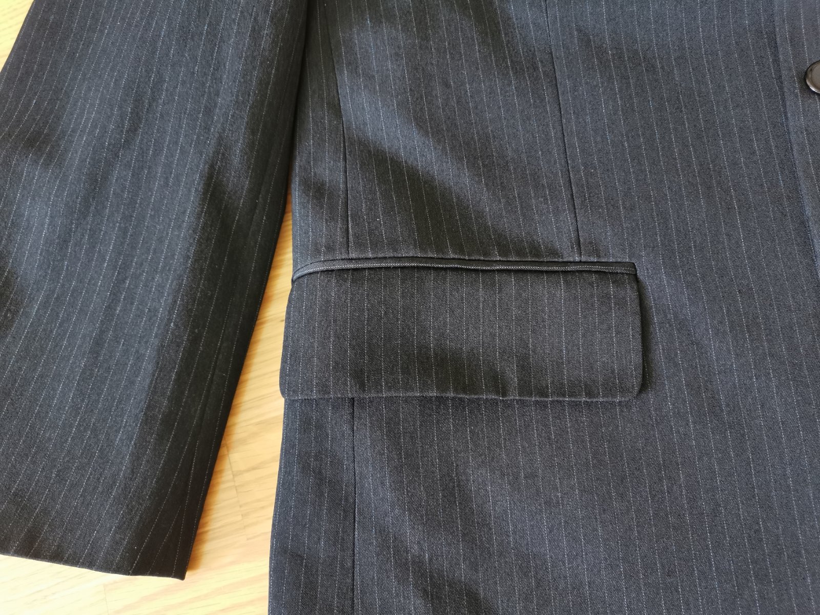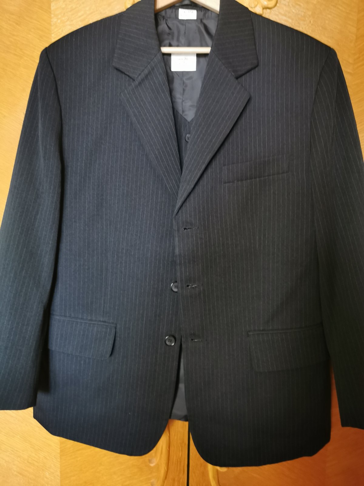 Pánsky oblek, ale iba dva krát oblečený. Trojkombinacia. Vesta 176/112, nohavice 176/98, sako 176/112. Farba čierna. Bol iba dva krát vzatý.