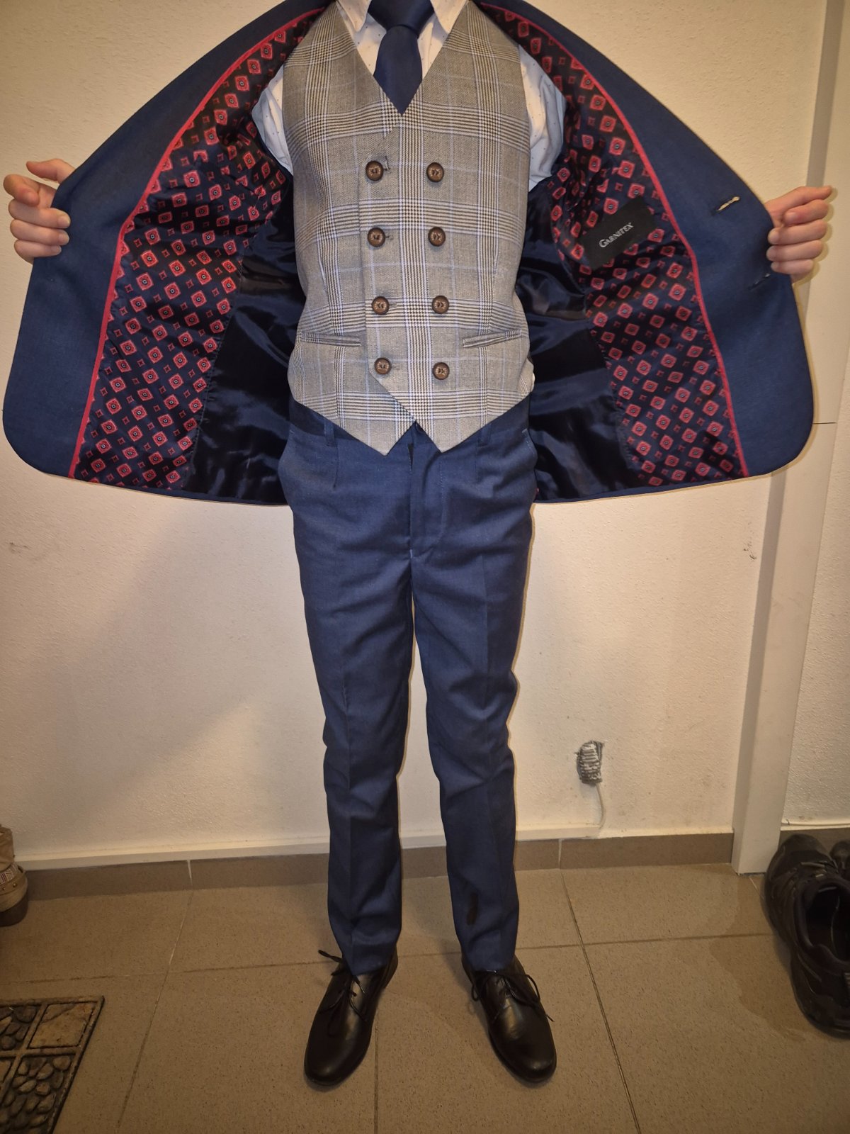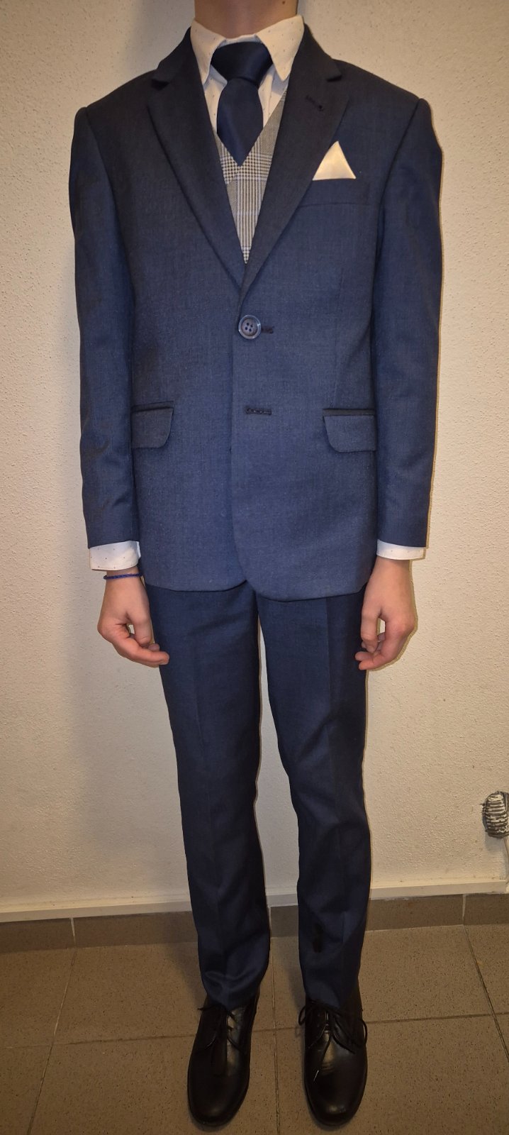 Ponúkam na predaj tento krásny komplet oblek oblečený jedine na prvom svätom prijímaní. Hneď sme z neho vyrástli. Je v tom sako, nohavice s gumičkou na páse, košeľa dlhý rukáv, vesticka, kravata, vreckovka do saka a kožené topánky číslo 33. Všetko pofotene. Je to veľkosť 128 ake my sme ju mali keď mal 8 takže skôr na staršieho ako je normálne veľkosť 128.