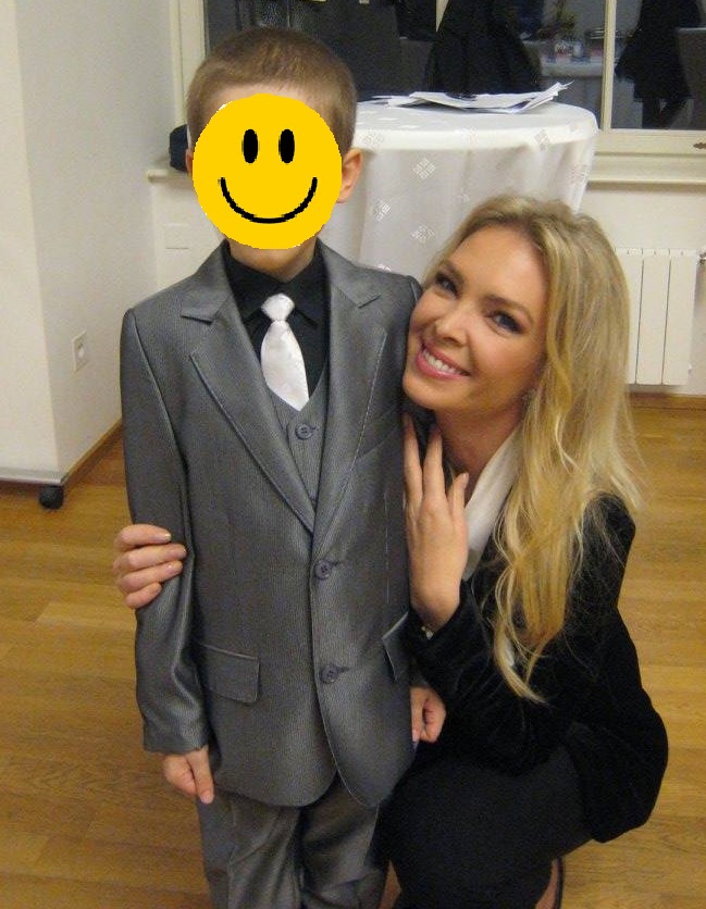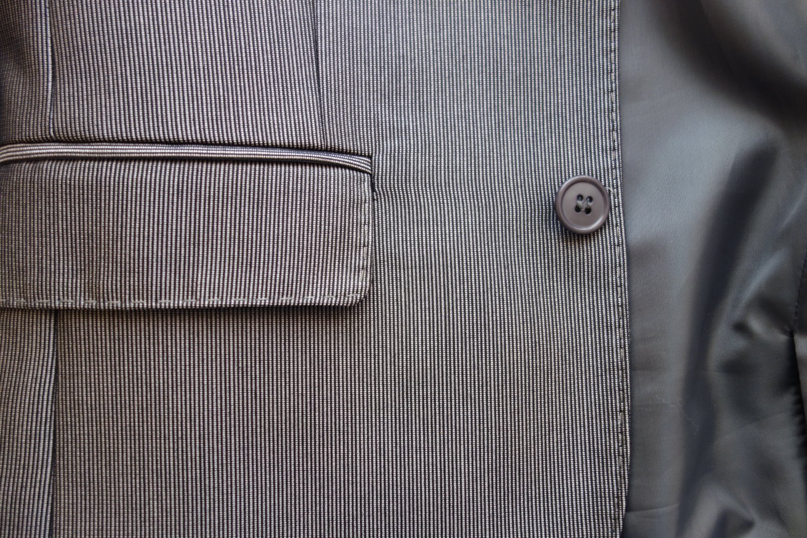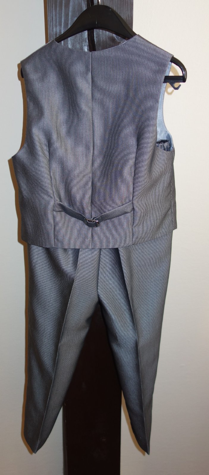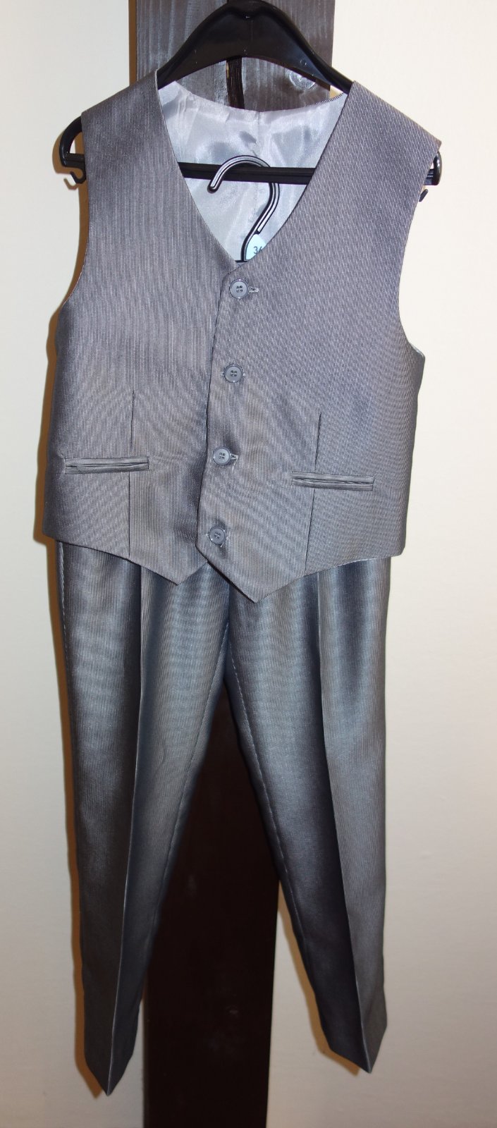 Oblek je strieborno-sivej farby pretkávanej s čiernou, takže pôsobí pásikavo. Skladá sa zo saka,vesty a nohavíc. Zloženie: 60% polyester, 25% vlna a 15% viskóza. Pranie na 40°C.