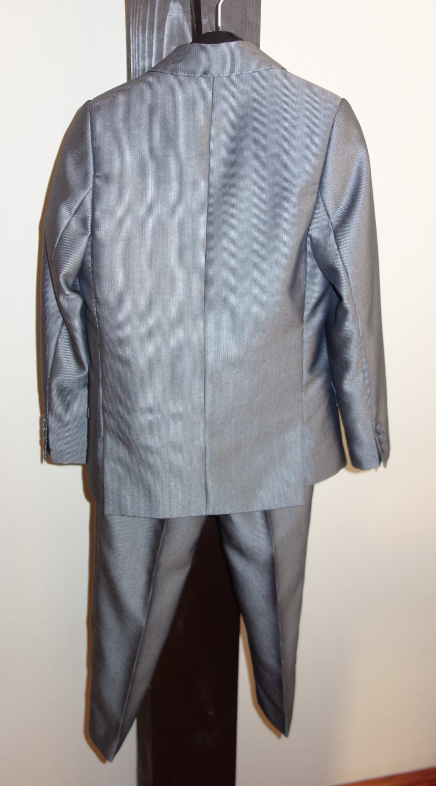 Chlapčenské formálne sako na jednoradové zapínanie 2 sivými gombíkmi. Sako je vybavené vnútorným funkčným vreckom, 1 funkčným vreckom na vreckovku a 2 falošnými vreckami. Na rukáve sú 3 sivé gombíky. Pre voľnejší pohyb sú na saku dva rázporky. Sivá vnútorná podšívka. Límec i vrecká majú pekný detail obšitia.