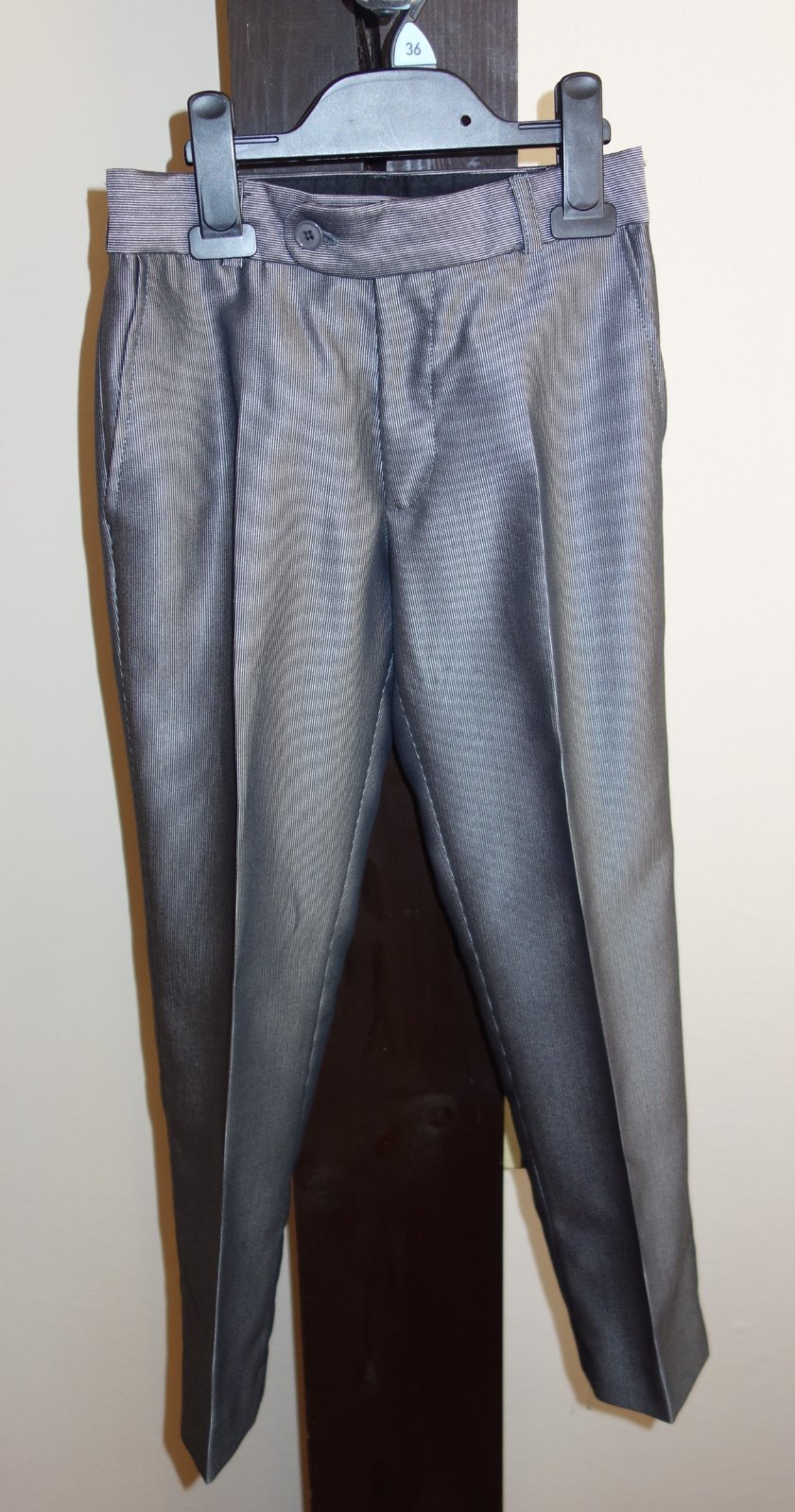 Nohavice majú 2 bočné funkčné vrecká, vzadu 1 funkčné zapínajúce vrecko na gombík. Pás má v bokoch zašitú gumu, takže po natiahnutí pridá zopár centimetrov naviac. 7 pútok umožňuje použiť opasok. Zapínanie nohavíc je na čierny zips, sivý gombík a skrýtý kovový háčik. Nohavice majú puky. Tak ako sako, aj nohavice majú krásny detail obšitia vrecák a pútok.