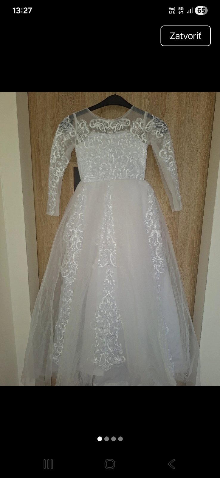 Šaty na prvé sväté prijímanie z bieleho saténu. Spodok šiat je vyrobený z bavlnenej podšívky, dodatočne zakončenej tylom. Krásna aplikácia ukončená perlami v páse. 3/4 rukáv. Dlhé šaty siahajú...