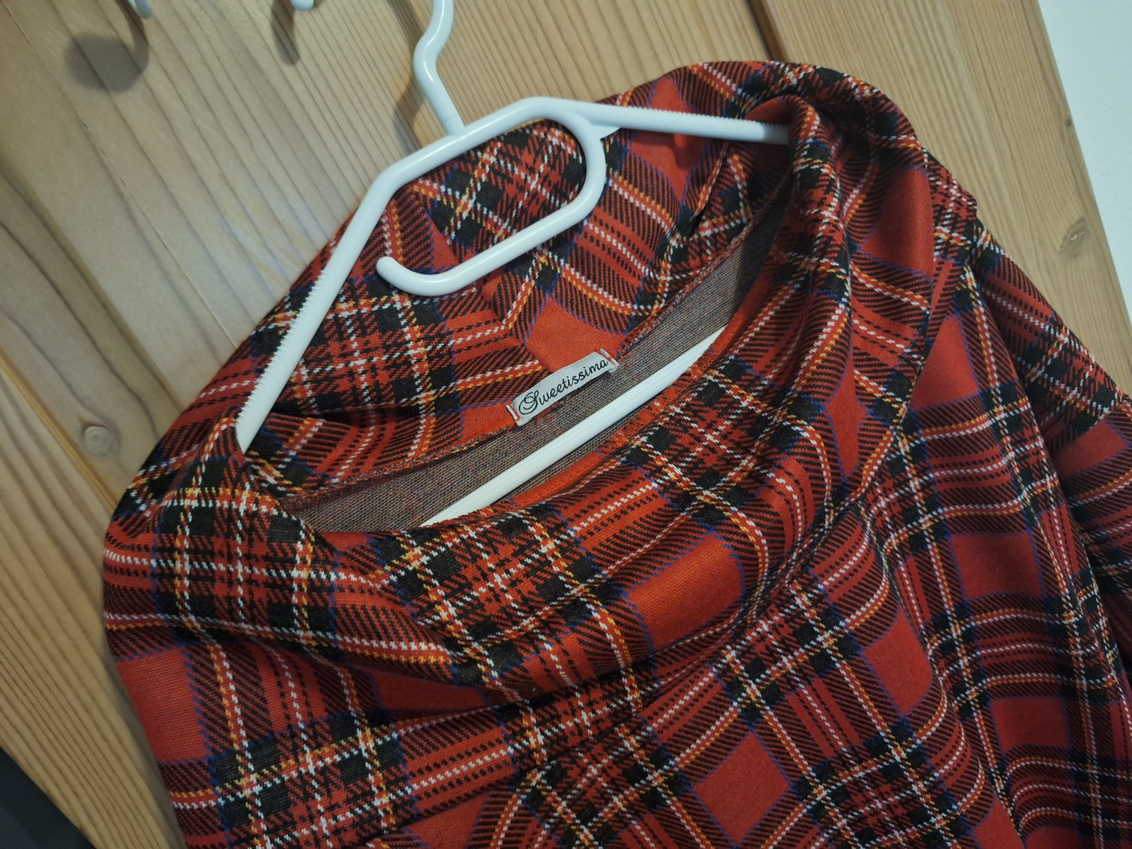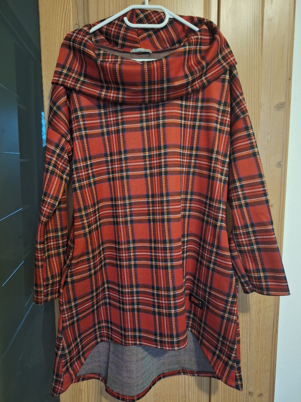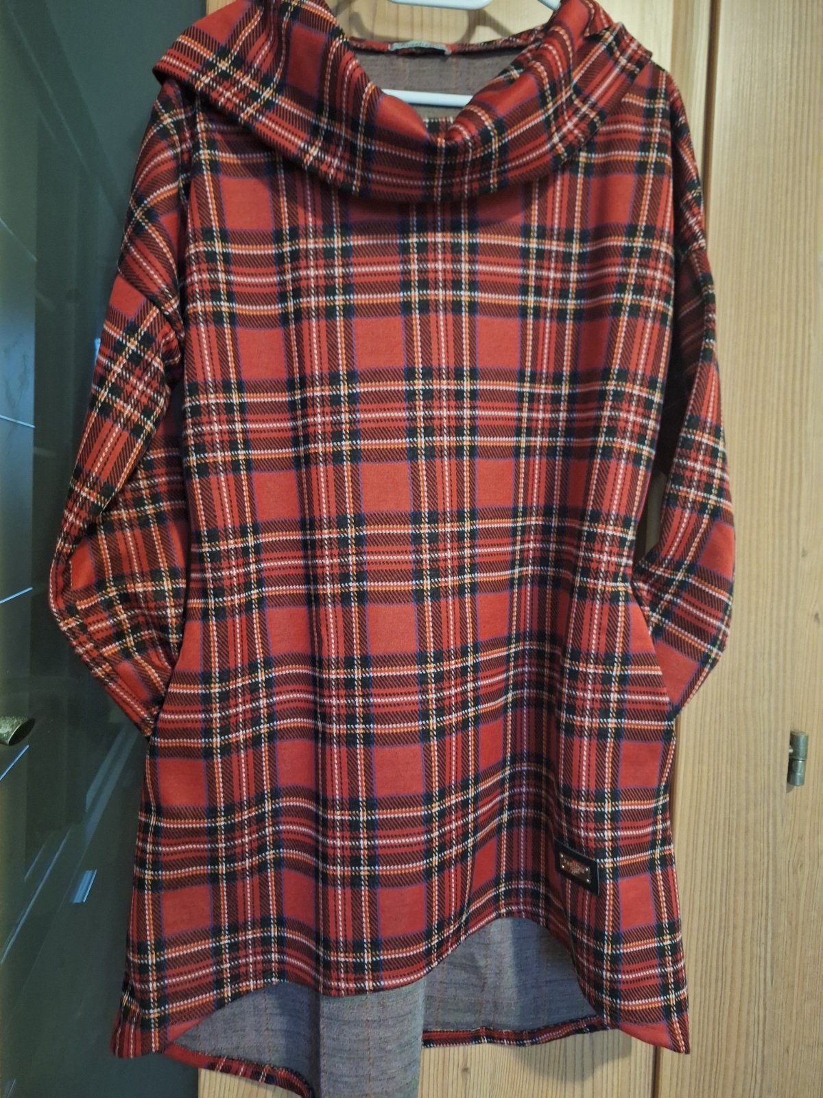 Ponúkam na predaj dámske športovo-elegantné vianočné tuniko-šaty, áčkového voľnejšieho strihu strihu, šaty sú vo výbornom stave vpredu kratšie, vzadu dlhšie, bočné vrecka, dlhý rukáv, horný lem okolo pliec tvorí vzadu kapucňu.