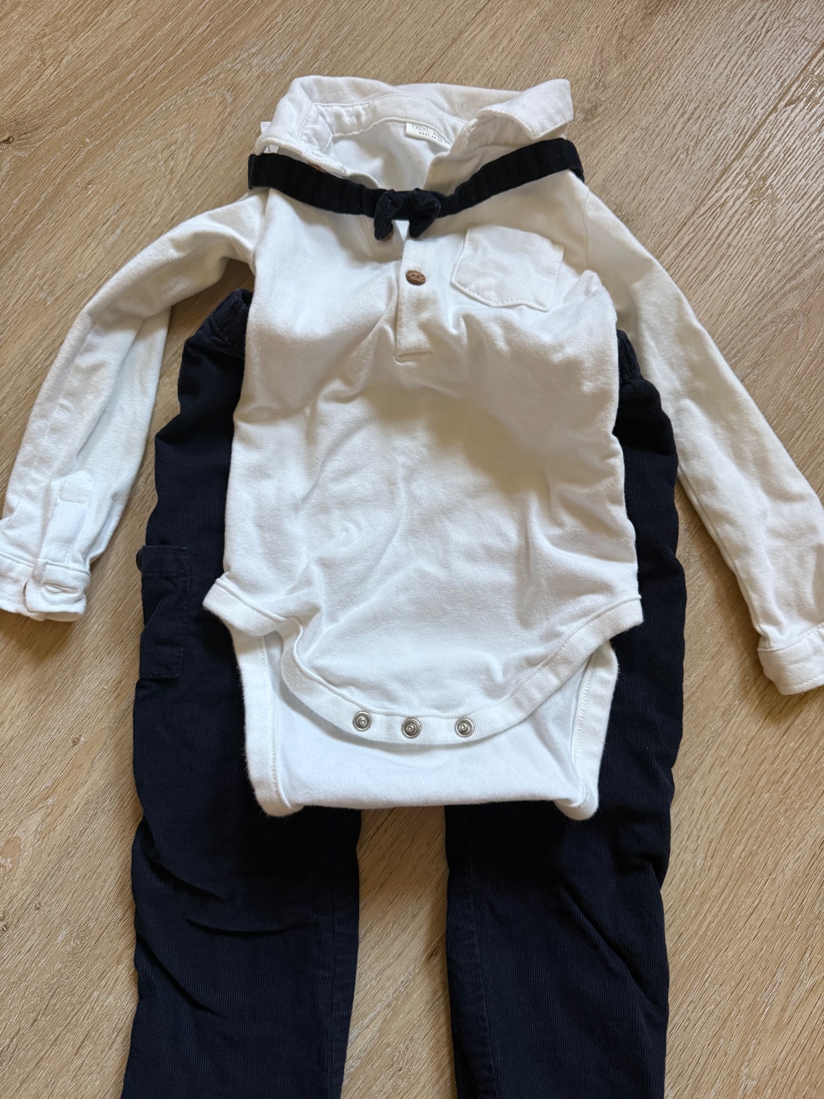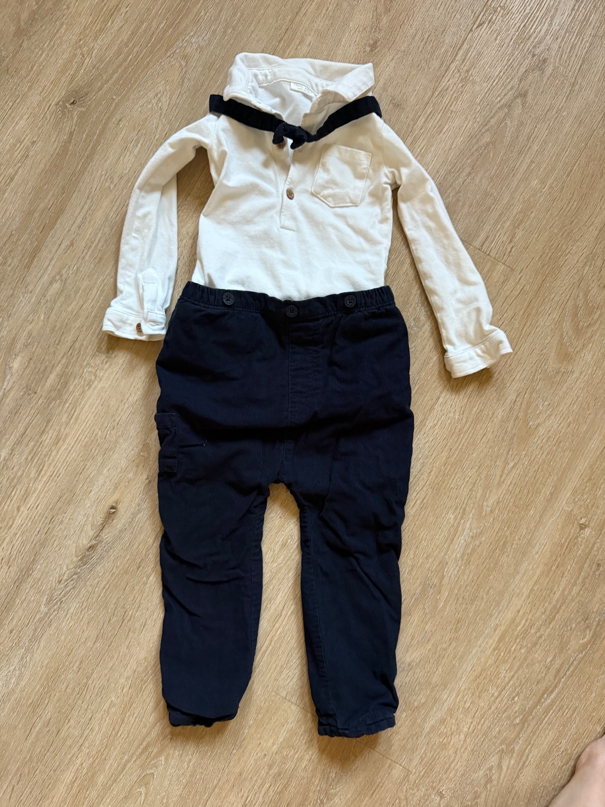 Súprava na krst Teodor Táto štýlová súprava obsahuje: - biela zateplená bundička - zateplená čiapočka s brmbolcom - tmavomodré nohavice - biele košeľobody - motýlik a traky - pletená vest...