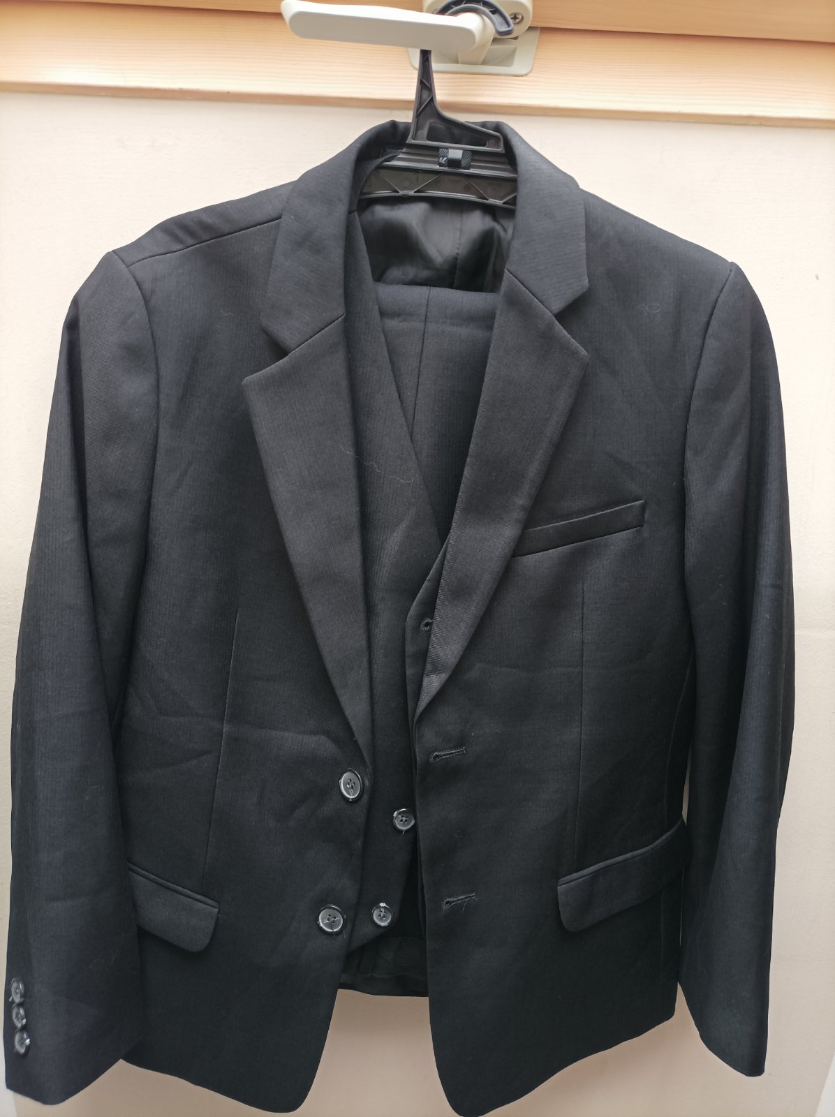 Čierny oblek na 1. sv. prijímanie alebo na svadbu, veľkosť taka väčšia 146, niečo medzi 146 a 152. Nohavice maju gumičku je vhodný aj pre chlapca čo má trošku bruško 🙂. Veľkosť nohavice: dĺžka 88,...
