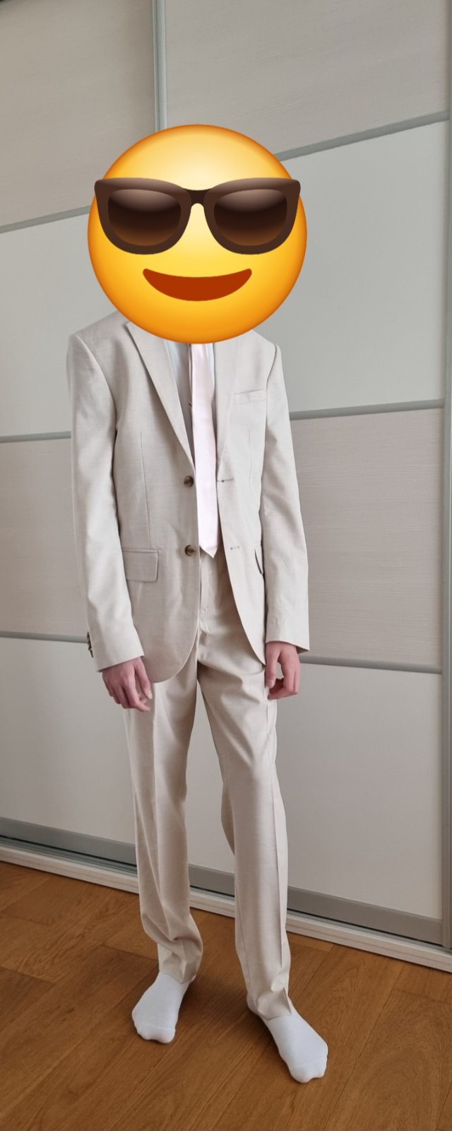 Oblek velkost XS junior pre stihleho mladeho muza 14 vyska 170/176 obleceny asi 2hodiny obrad a fotenie top stav nohavice sa daju popustit na dlzku a uprava pasu mozna tiez
