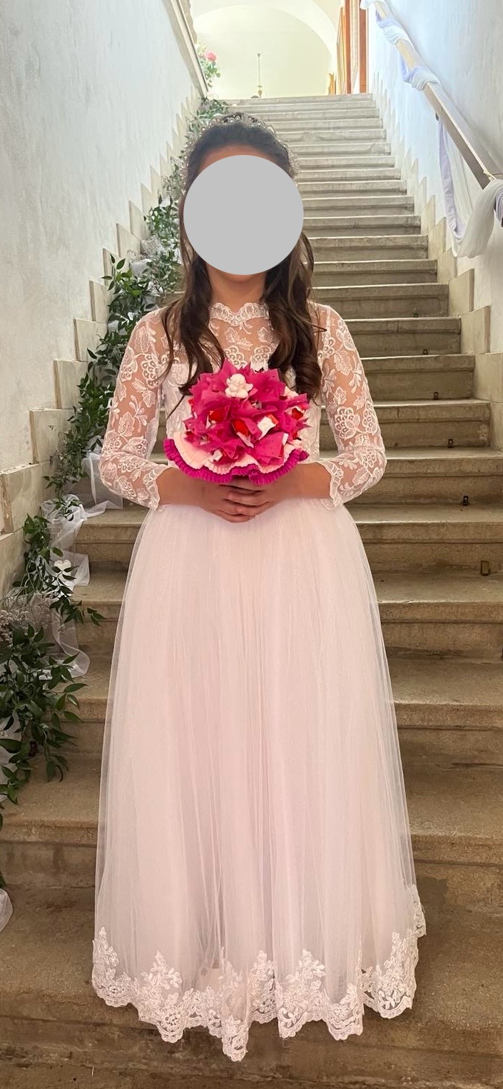 Krásne šaty na 1. sv. prijímanie. Sú šité na mieru. Vzadu sa nachádza šnurovačka, kedy sa vedia šaty prispôsobiť postave.