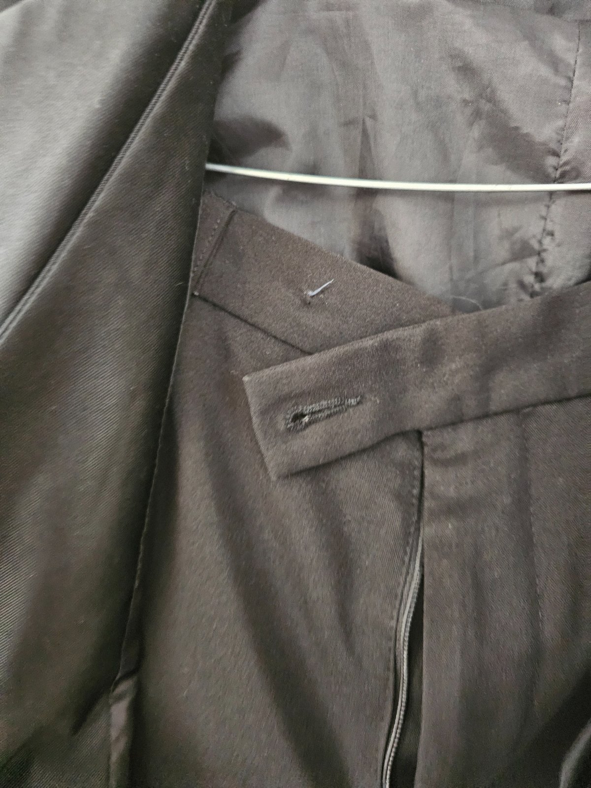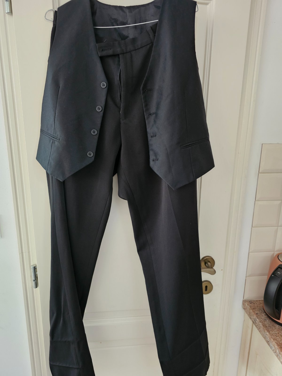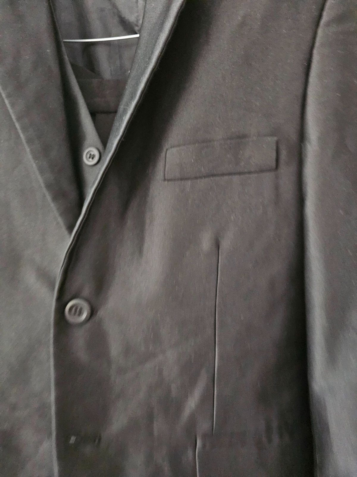 Sako, vesta, nohavice. Sako sirka 49cm, dlzka 67cm, rukav od ramena 56cm. Vesta sirka 44cm.Nohavice sirka 42cm, dlzka 114 cm. CHyby: chyba gombik na nohaviciach, nohavice boli skracovane a kedze nie su vyzehlene, tie zahyby vidiet, podla mna to pojde vyzehlit. Vesticka pod pazuskou jednou na sviku sa para.