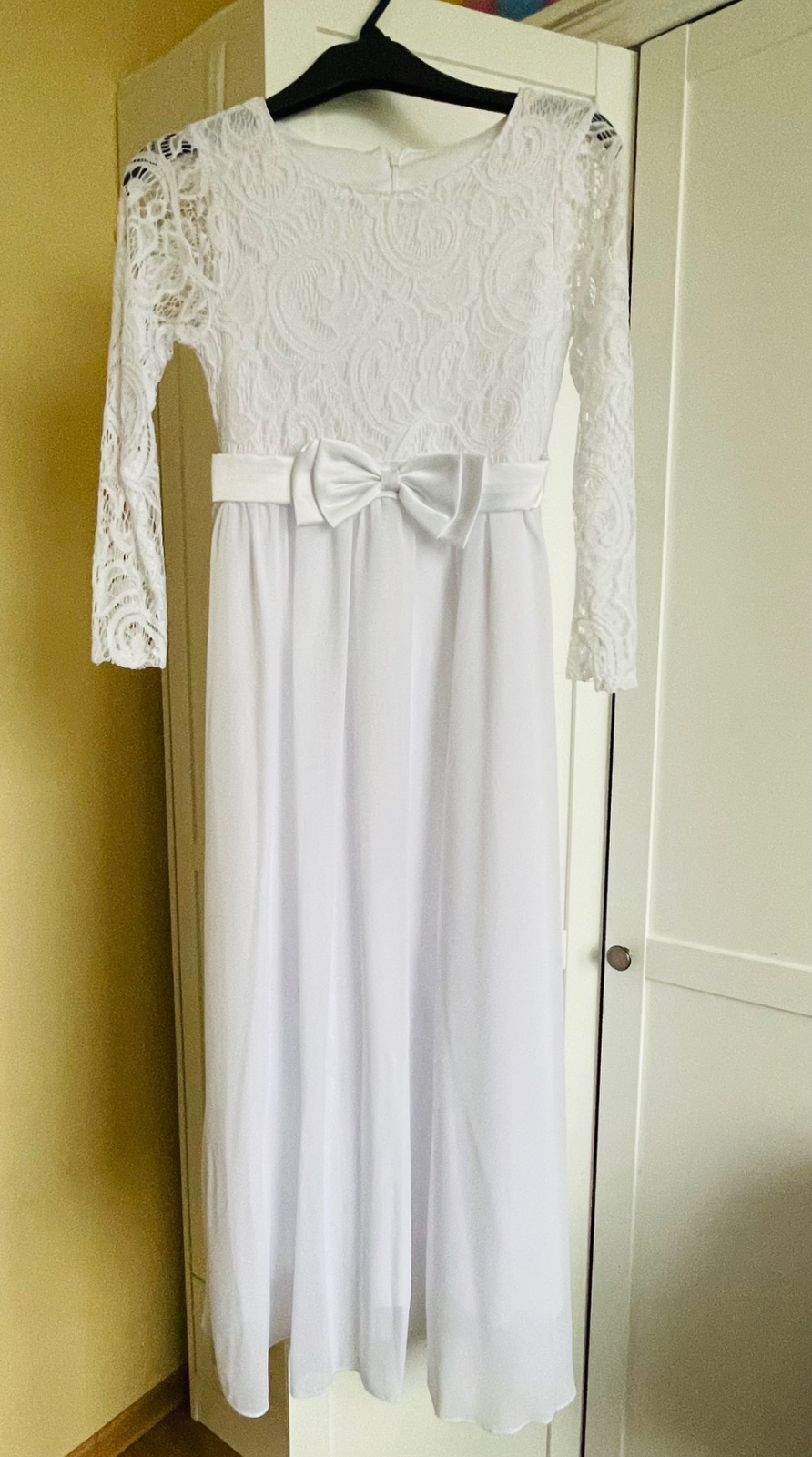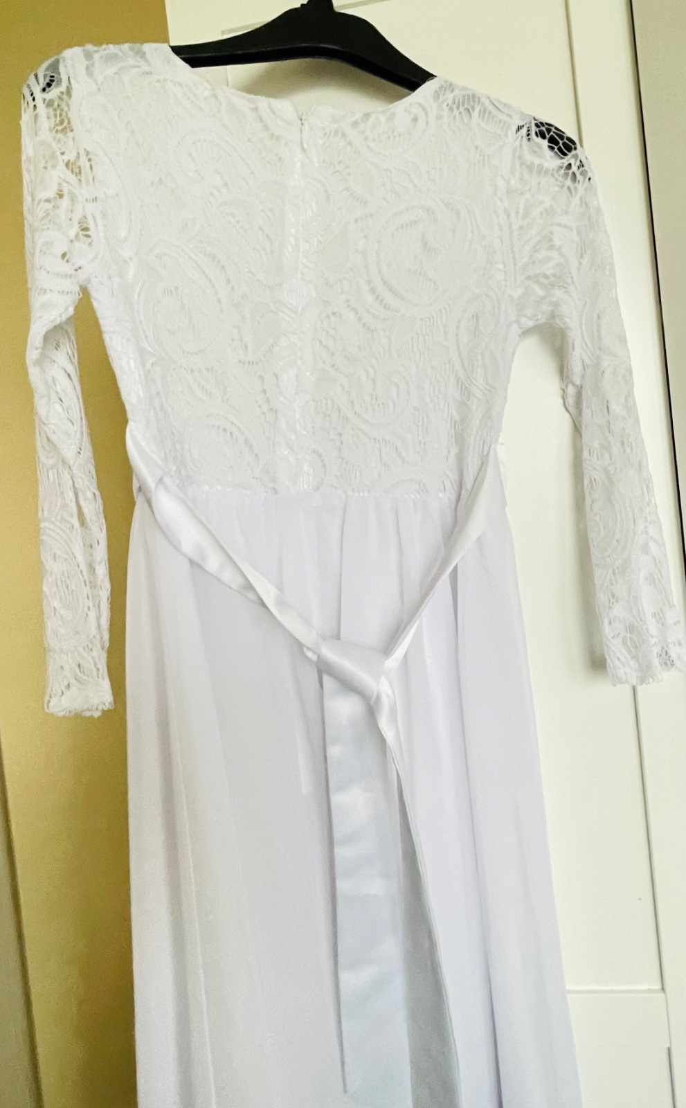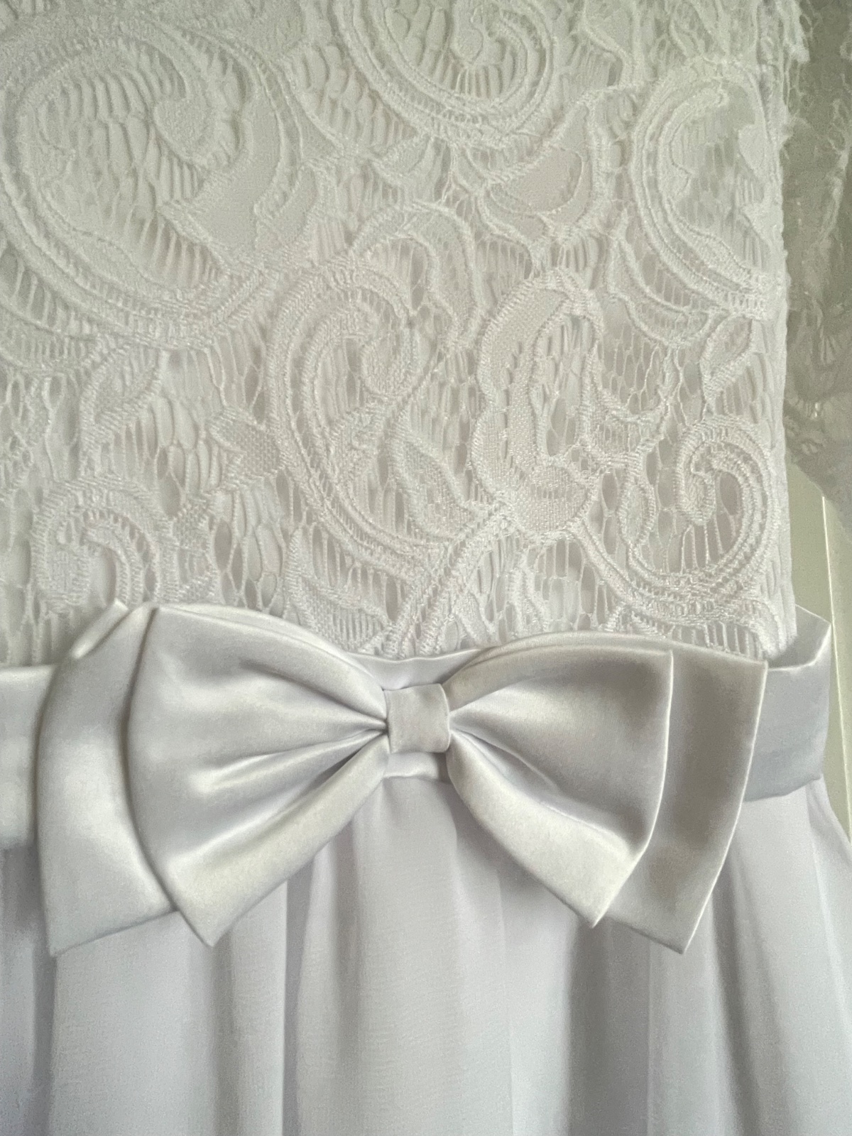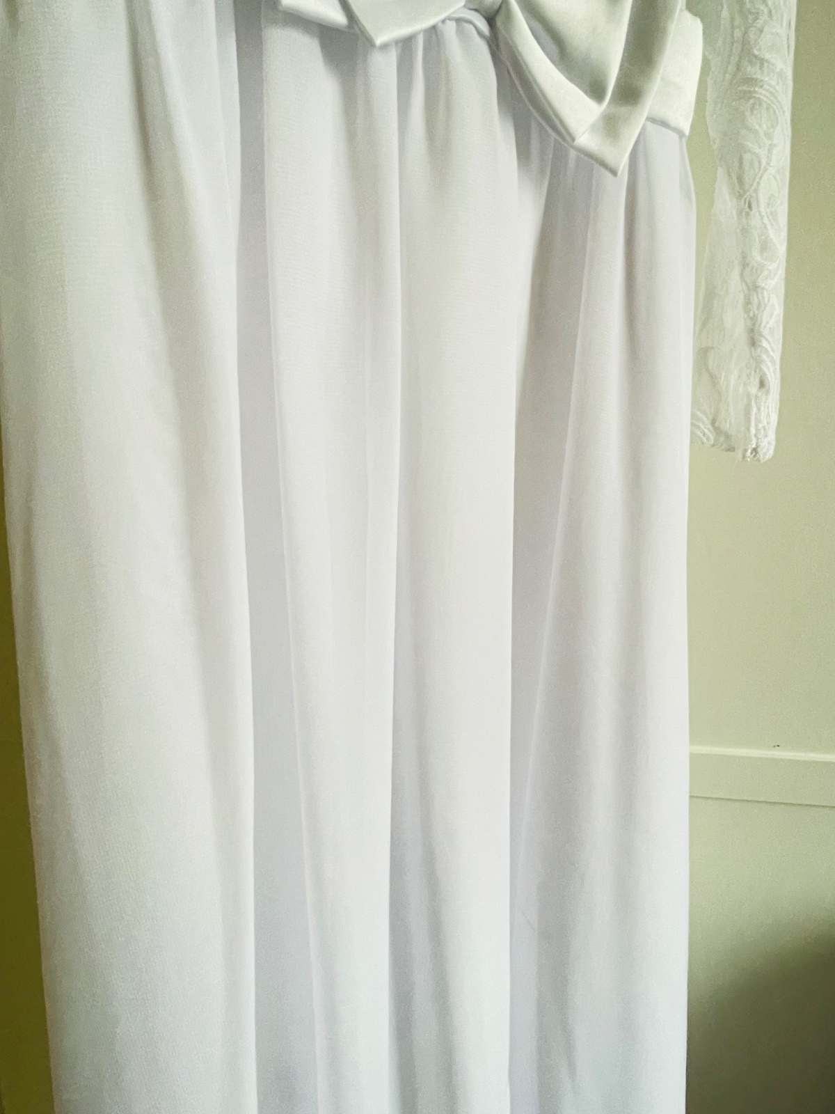 Lahke padave saty s cipkou, zapinanie na zips, v pase zavazovacia stuha, ktora zvyrazni driek. Celkova dlzka 104cm, sirka v pase v klude 35cm.