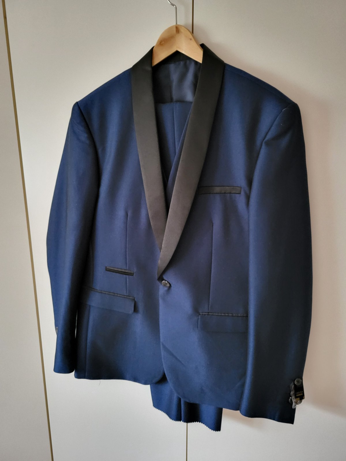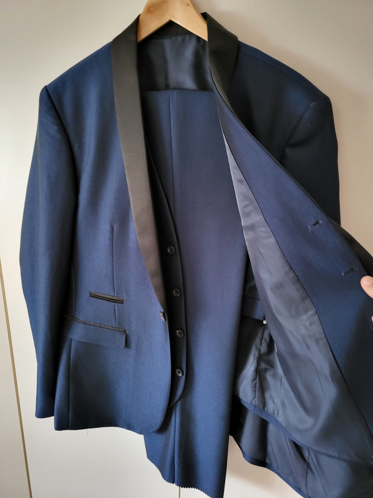 Predám krásny modry oblek s vestou a nohavicami na prispôsobenie veľkosť obleku L je dvakrát oblečený ako novy vnútro vzor ako na foto nádherný oblek cena komplet 50 eur v prípade záujmu pošlem aj ...