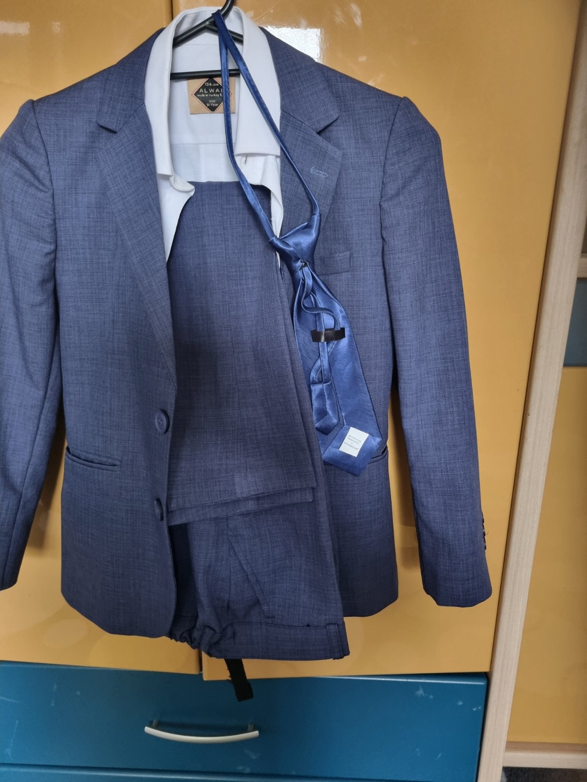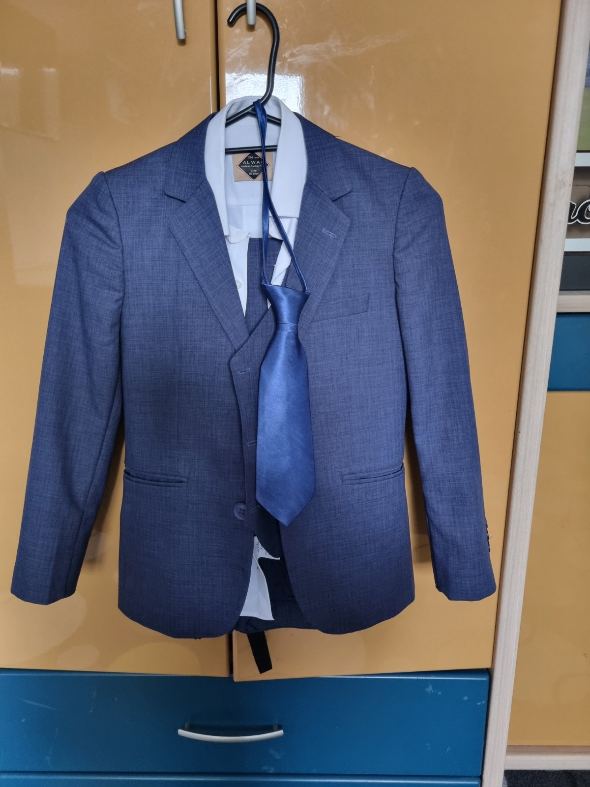 Kompletný oblek. Zložený -modré sako -modré nohavice -modrá kravata -biela košeľa -modrá vesta