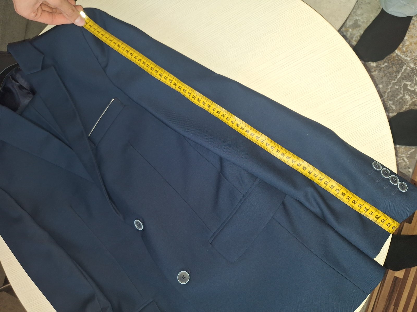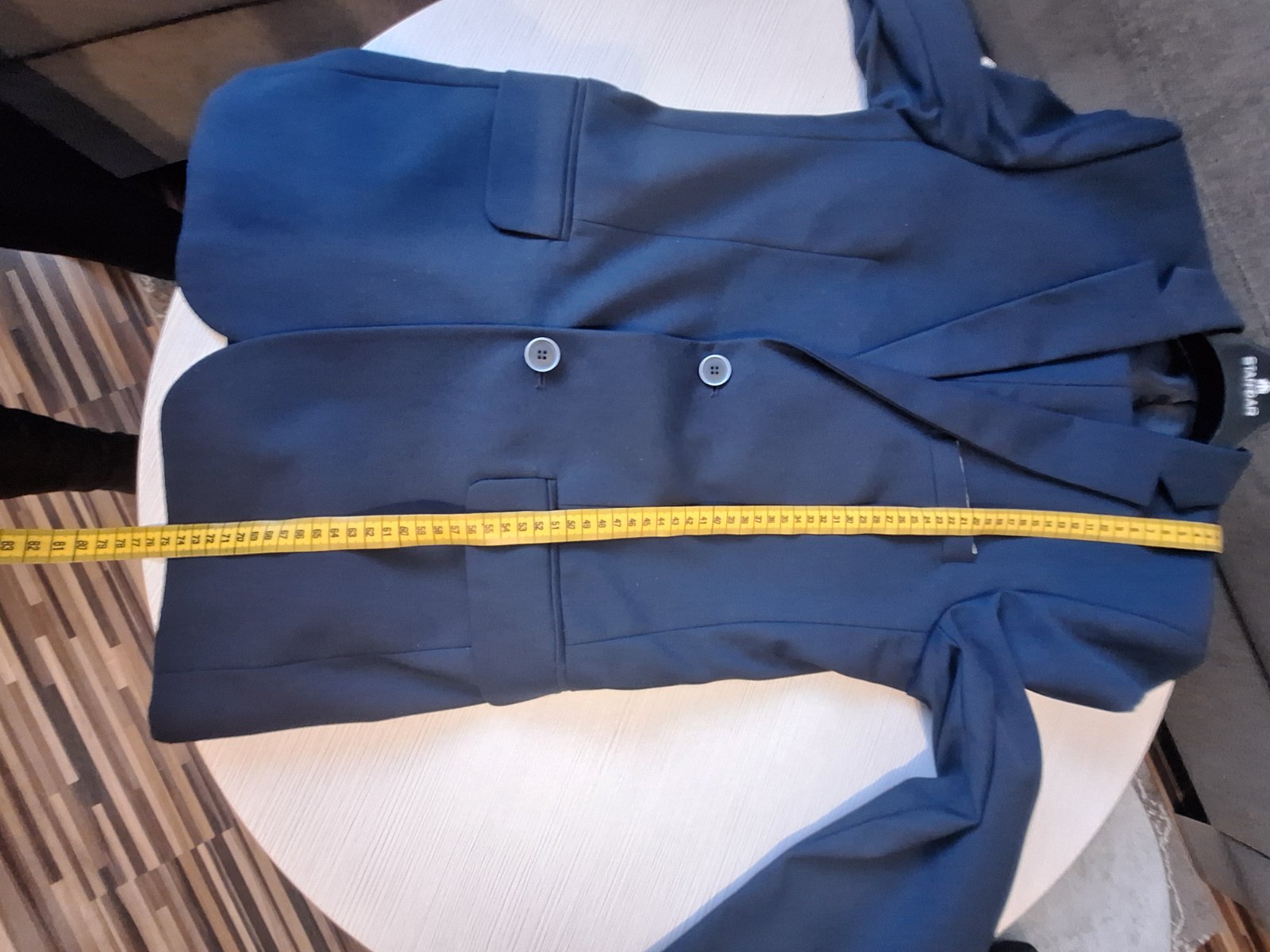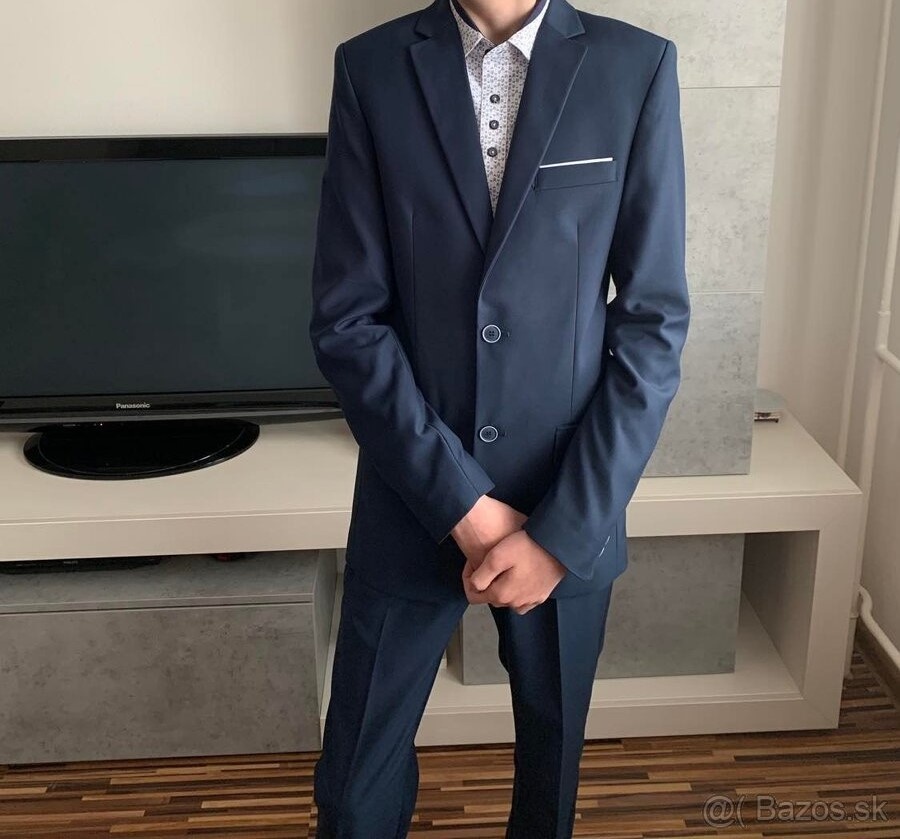 Predam raz obleceny oblek(na birmovke),kupeny v H&M,prijemna modra farba. Rozmery: dĺžka nohavic- 106cm sirka v pase nohavic- 45cm×2 dĺžka saka- 77cm dĺžka rukavu od ramena- 66cm sirka pod pazuch...
