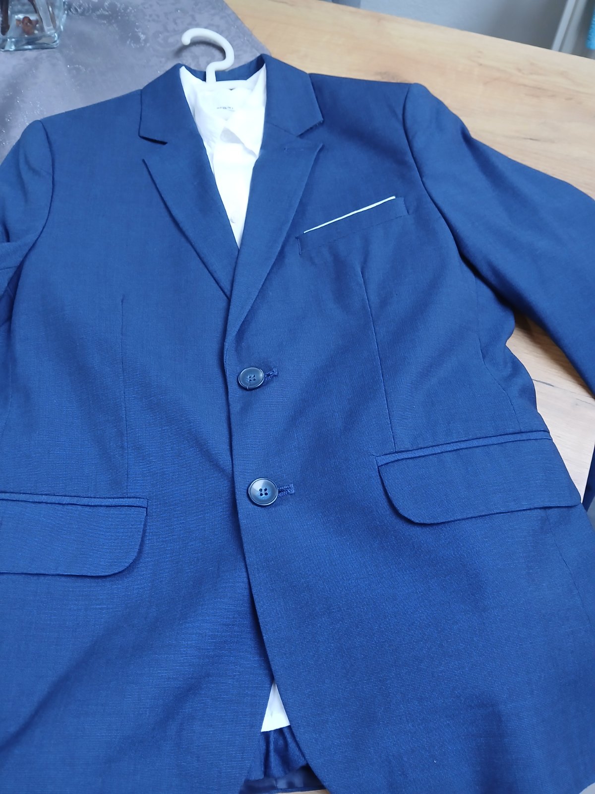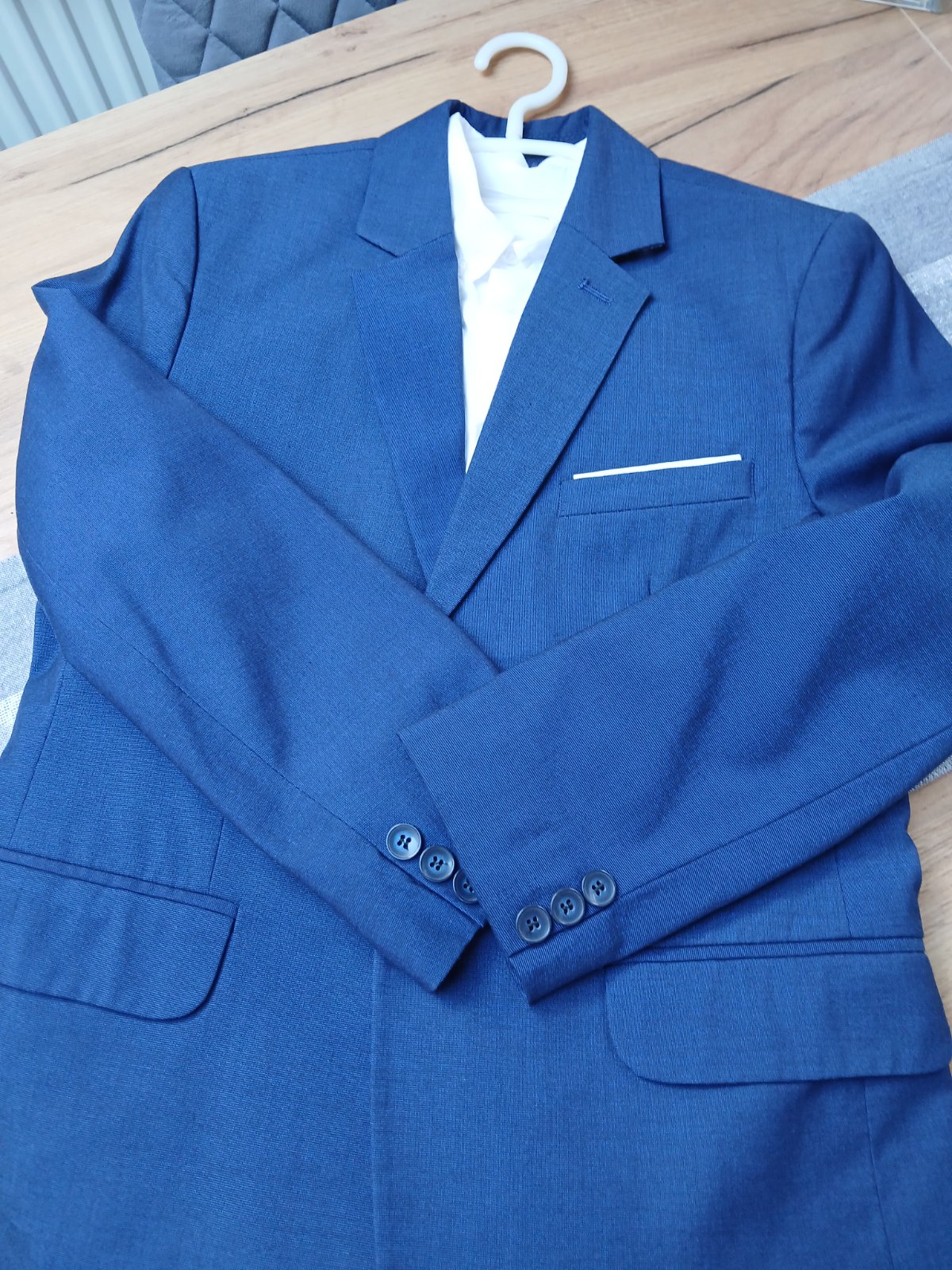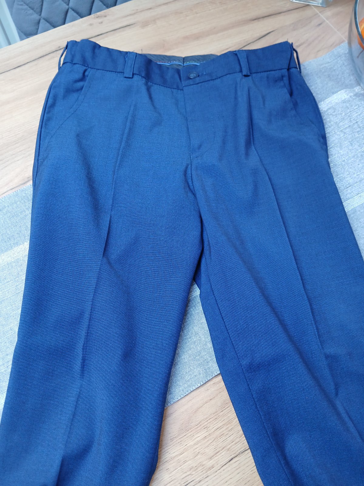 Predám oblek 1xpouzity aj s košeľou Dĺžka sa je 62,šírka cez prsia 46x2,dĺžka rukáva od krku je 62cm,dĺžka nohavice 71 a pásom, obvod pása navolno 39x2,dá sa stiahnuť posuvnou gumičkou, nie sú slim. Mater5prijemny polyester s viskozou, značka Standar.