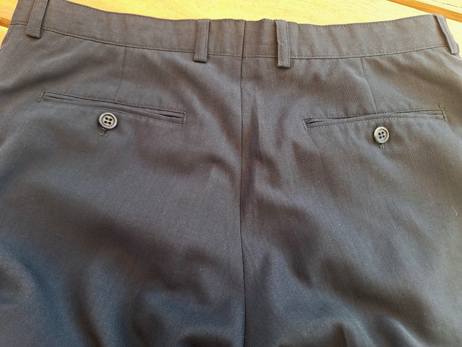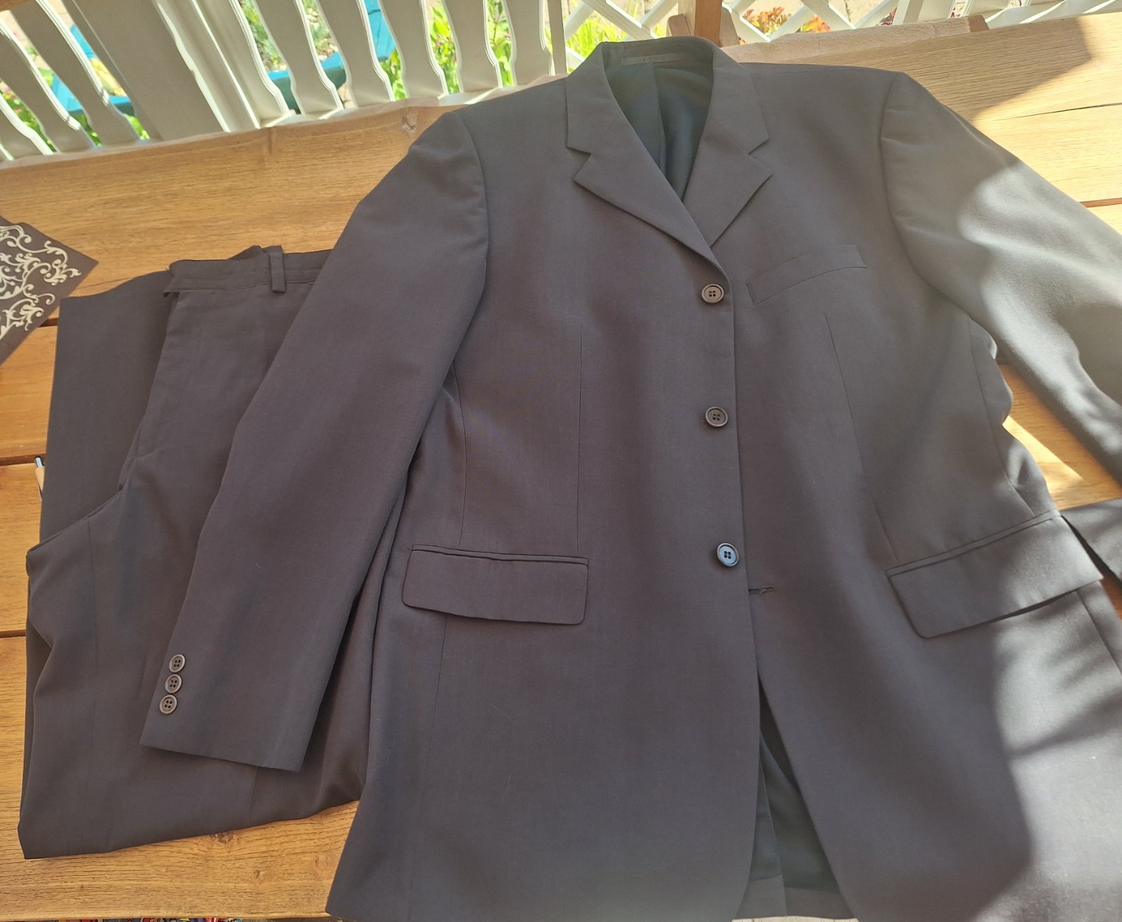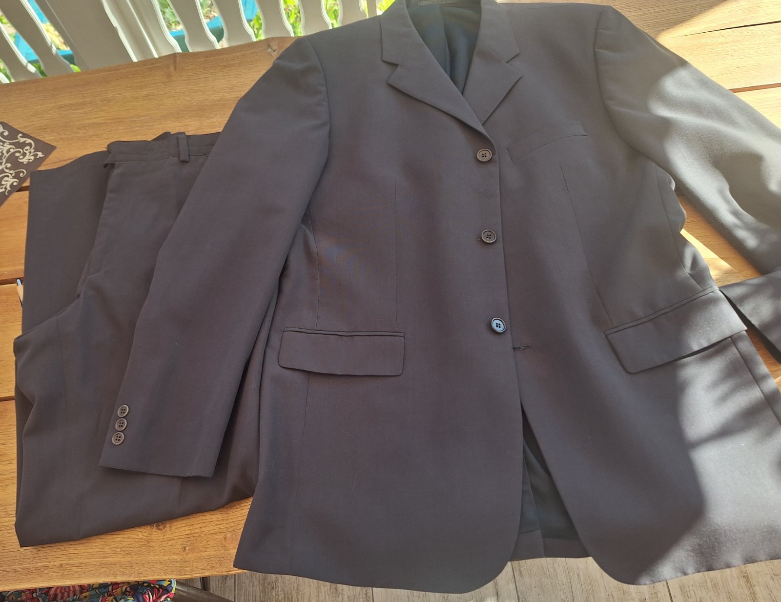 Predám značkový oblek, ako nový, rovný strih. Farba je ako na hlavnej fotke, tmavošedá. Sako d.86, šírka v podpaz. 2x60, rukávy od ramena 69, v podpaz.48 cm. Nohavice-vonkajšia dlžka 111, v rozkroku 85, pás v klude 2x43-46, šírka úplne dole 2x23 cm. Poštovné na adresu +4€, na poštu +4€.