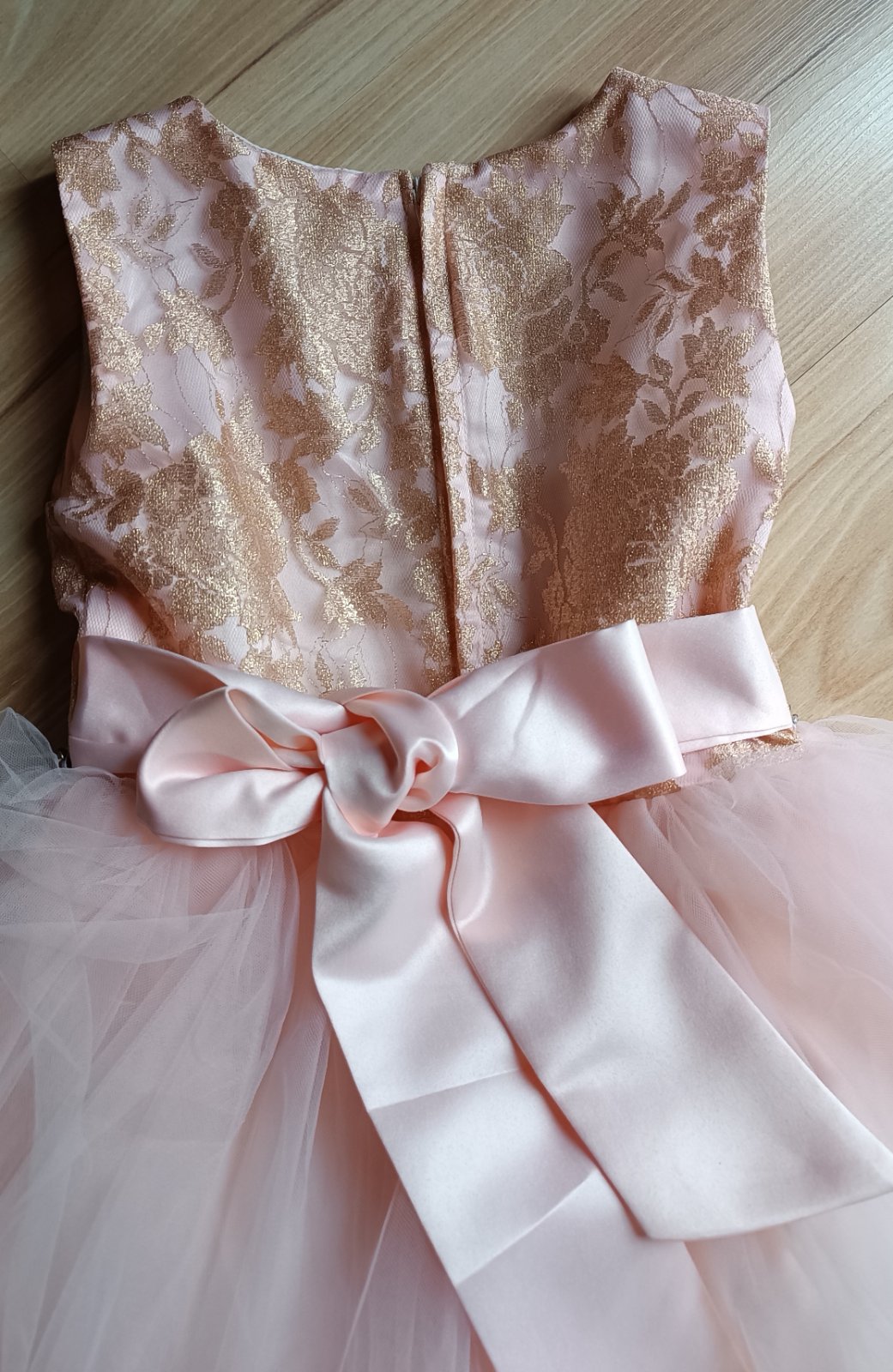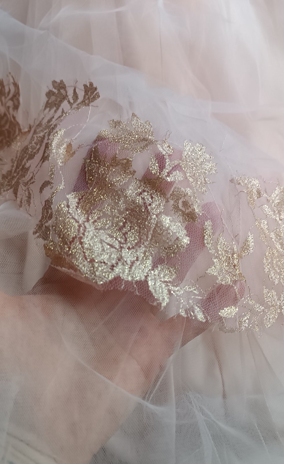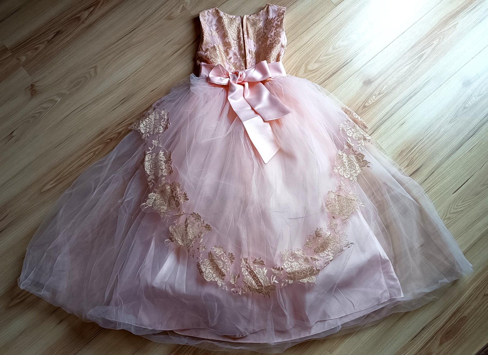 Raz oblečené prenádherné široké bledoružové saténové šaty prešité jemným tylom ( na sukni dve vrstvy) so zlatou potlačou ruží..