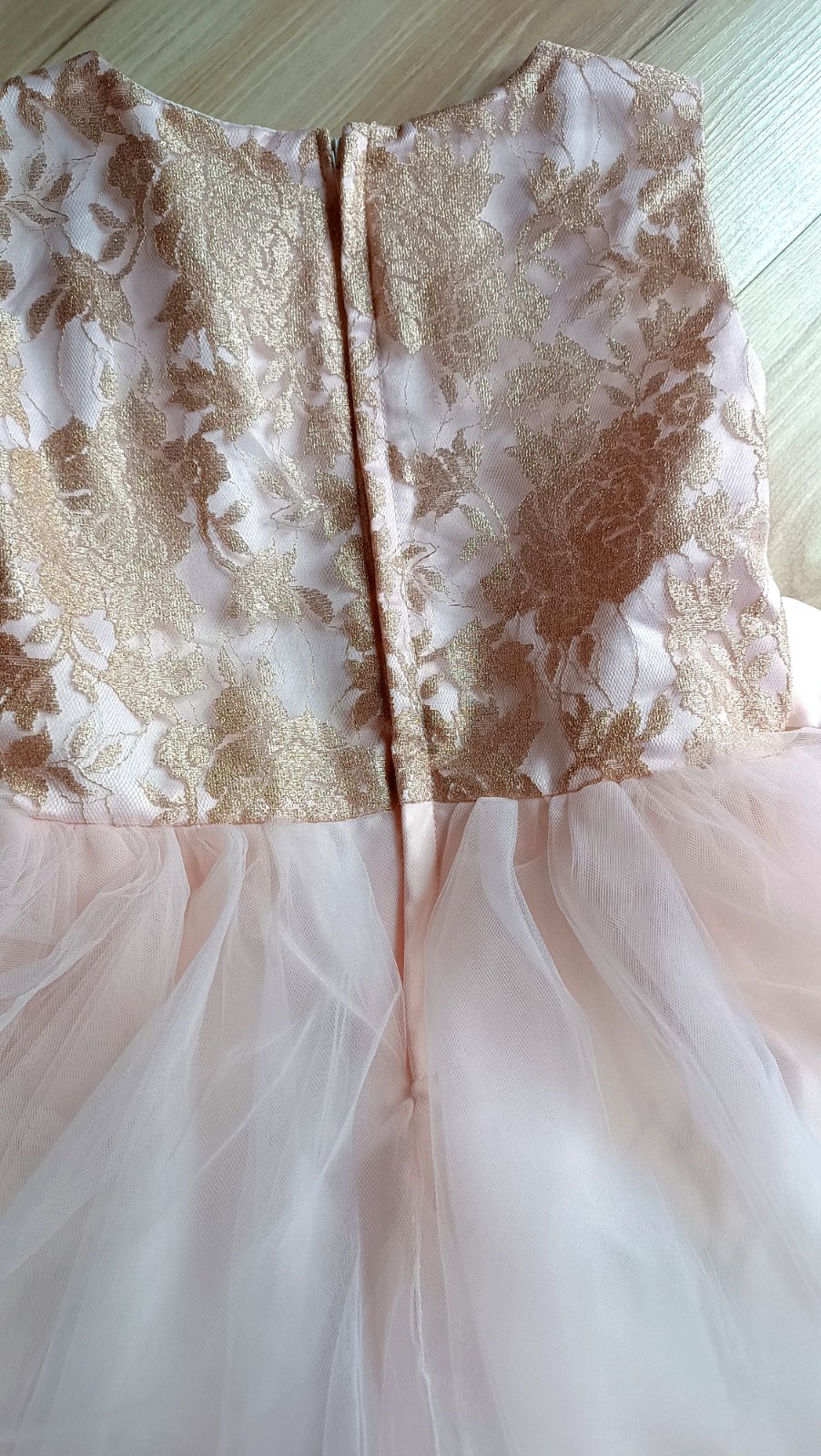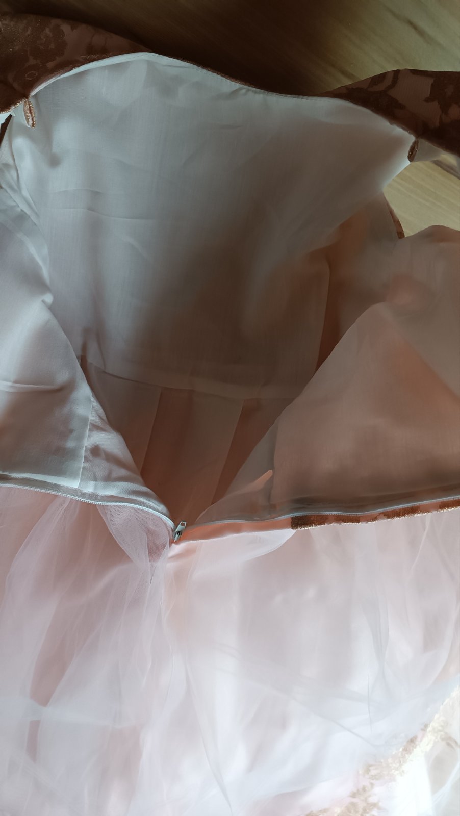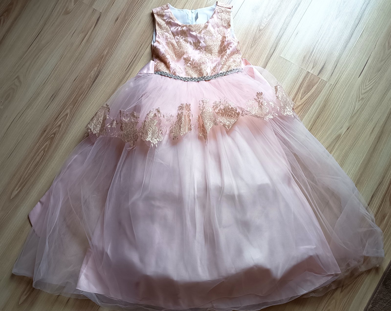 Raz oblečené prenádherné široké bledoružové saténové šaty prešité jemným tylom ( na sukni dve vrstvy) so zlatou potlačou ruží..